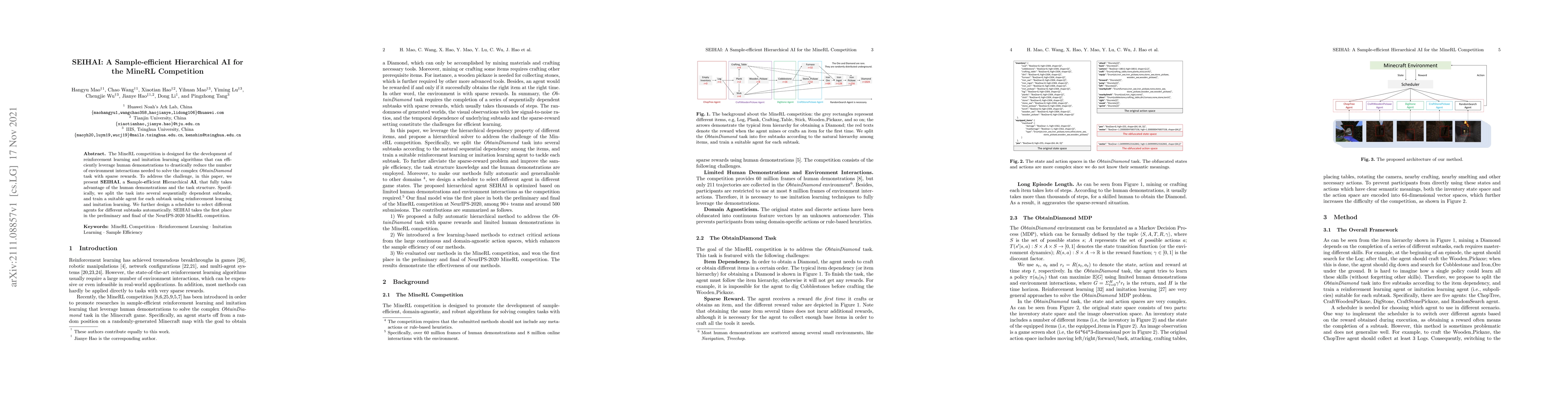 SEIHAI is a sample-efficient hierarchical AI designed to tackle the MineRL competition's ObtainDiamond task by leveraging human demonstrations and task structure. It splits the task into subtasks, trains specialized agents for each, and uses a scheduler to dynamically select agents, achieving top performance in the competition.