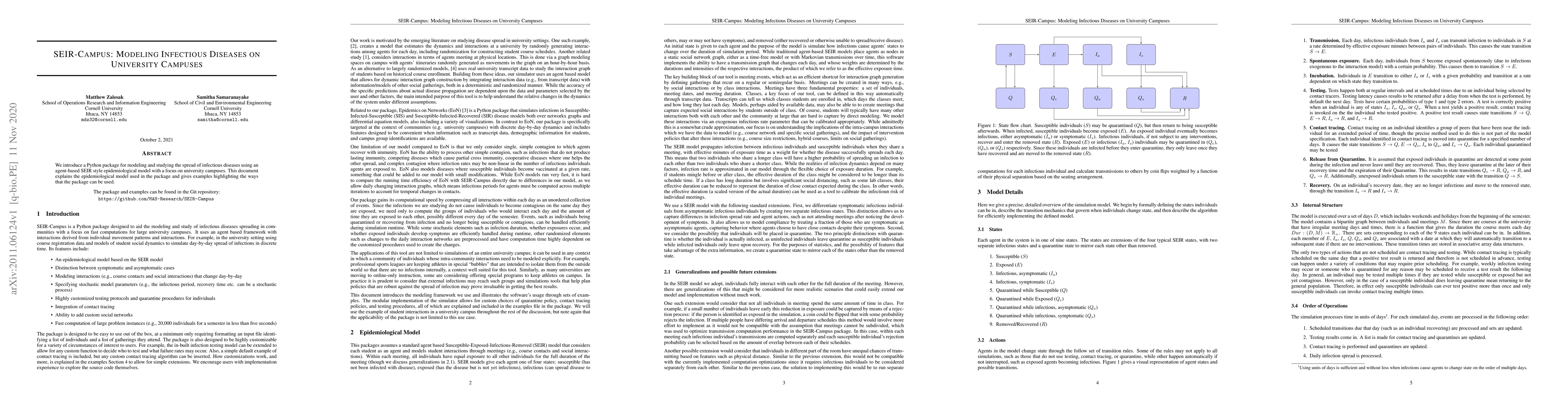 We introduce a Python package for modeling and studying the spread of infectious diseases using an agent-based SEIR style epidemiological model with a focus on university campuses. This document explains the epidemiological model used in the package and gives examples highlighting the ways that the package can be used.