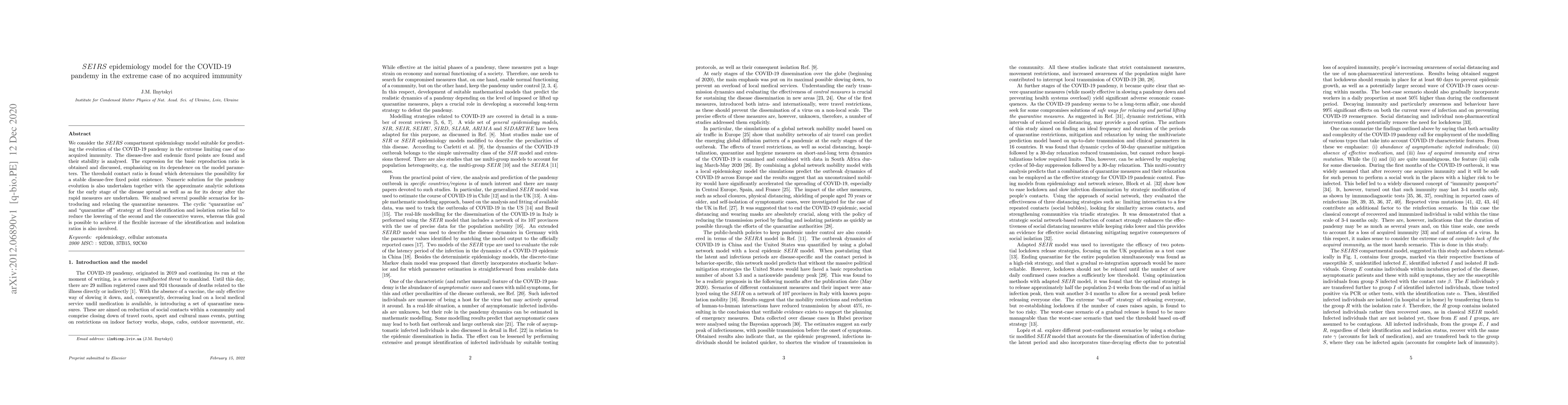We consider the SEIRS compartment epidemiology model suitable for predicting the evolution of the COVID-19 pandemy in the extreme limiting case of no acquired immunity. The disease-free and endemic fixed points are found and their stability is analysed. The expression for the basic reproduction ratio is obtained and discussed, emphasizing on its dependence on the model parameters. The threshold contact ratio is found which determines the possibility for a stable disease-free fixed point existence. Numeric solution for the pandemy evolution is also undertaken together with the approximate analytic solutions for the early stage of the disease spread as well as as for its decay after the rapid measures are undertaken. We analysed several possible scenarios for introducing and relaxing the quarantine measures. The cyclic "quarantine on" and "quarantine off" strategy at fixed identification and isolation ratios fail to reduce the lowering of the second and the consecutive waves, whereas this goal is possible to achieve if the flexible increase of the identification and isolation ratios is also involved.
