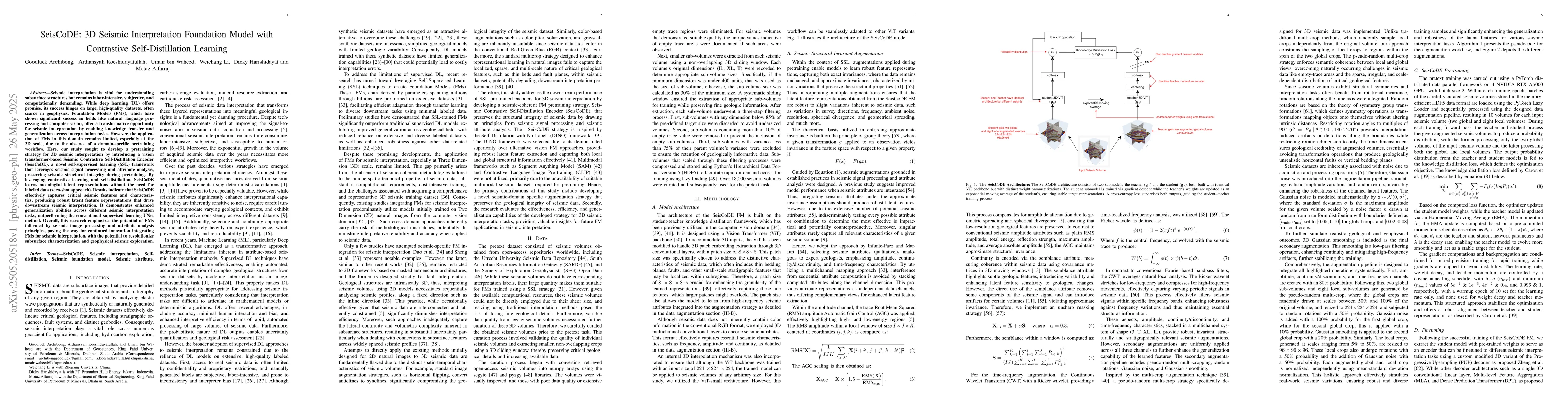 The research introduces Seismic Contrastive Self-Distillation Encoder (SeisCoDE), a vision transformer-based self-supervised learning (SSL) framework for 3D seismic interpretation pretraining. SeisCoDE leverages seismic signal processing and attribute analysis, employing contrastive learning and self-distillation to learn meaningful latent representations without labeled data.