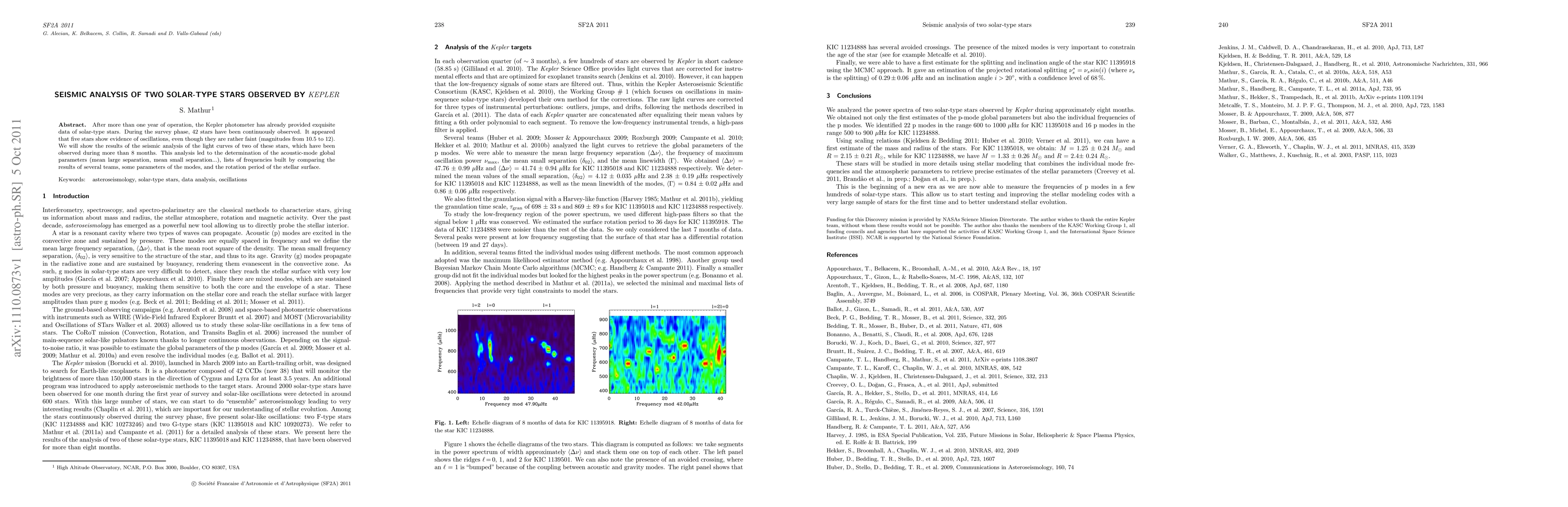 After more than one year of operation, the Kepler photometer has already provided exquisite data of solar-type stars. During the survey phase, 42 stars have been continuously observed. It appeared that five stars show evidence of oscillations, even though they are rather faint (magnitudes from 10.5 to 12). We will show the results of the seismic analysis of the light curves of two of these stars, which have been observed during more than 8 months. This analysis led to the determination of the acoustic-mode global parameters (mean large separation, mean small separation...), lists of frequencies built by comparing the results of several teams, some parameters of the modes, and the rotation period of the stellar surface.