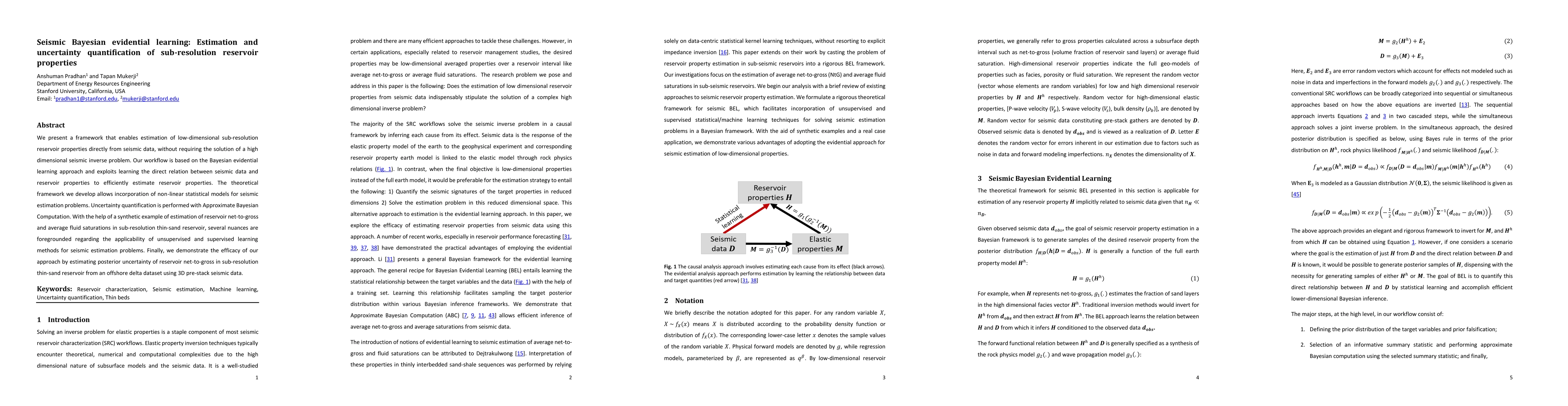 This paper introduces a Bayesian evidential learning framework for estimating sub-resolution reservoir properties from seismic data, bypassing high-dimensional inverse problems. The method incorporates non-linear statistical models and uses Approximate Bayesian Computation for uncertainty quantification, demonstrated through synthetic and real-world offshore delta datasets.