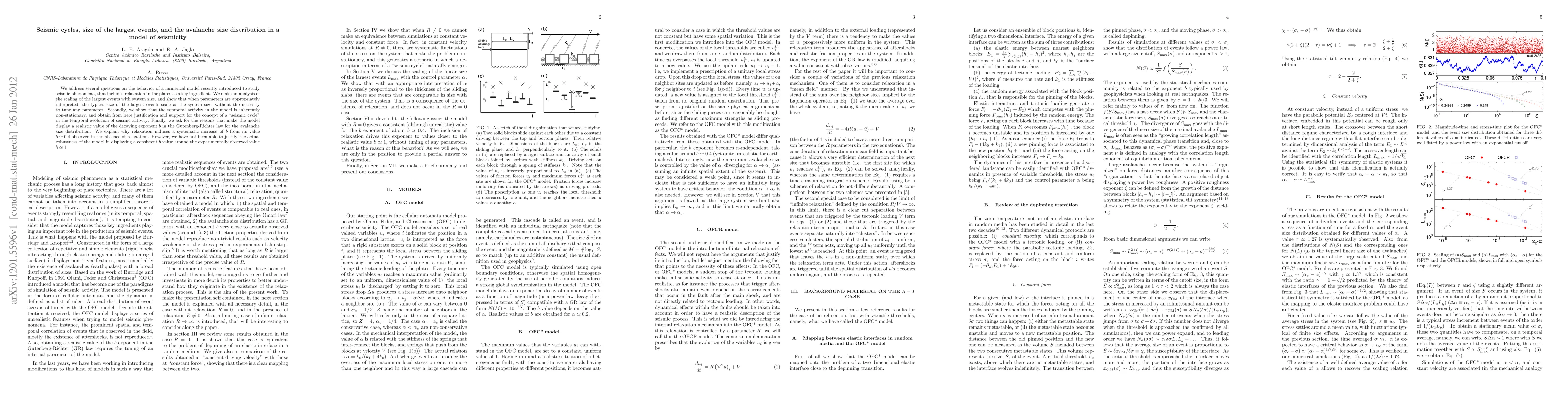 We address several questions on the behavior of a numerical model recently introduced to study seismic phenomena, that includes relaxation in the plates as a key ingredient. We make an analysis of the scaling of the largest events with system size, and show that when parameters are appropriately interpreted, the typical size of the largest events scale as the system size, without the necessity to tune any parameter. Secondly, we show that the temporal activity in the model is inherently non-stationary, and obtain from here justification and support for the concept of a "seismic cycle" in the temporal evolution of seismic activity. Finally, we ask for the reasons that make the model display a realistic value of the decaying exponent $b$ in the Gutenberg-Richter law for the avalanche size distribution. We explain why relaxation induces a systematic increase of $b$ from its value $b\simeq 0.4$ observed in the absence of relaxation. However, we have not been able to justify the actual robustness of the model in displaying a consistent $b$ value around the experimentally observed value $b\simeq 1$.