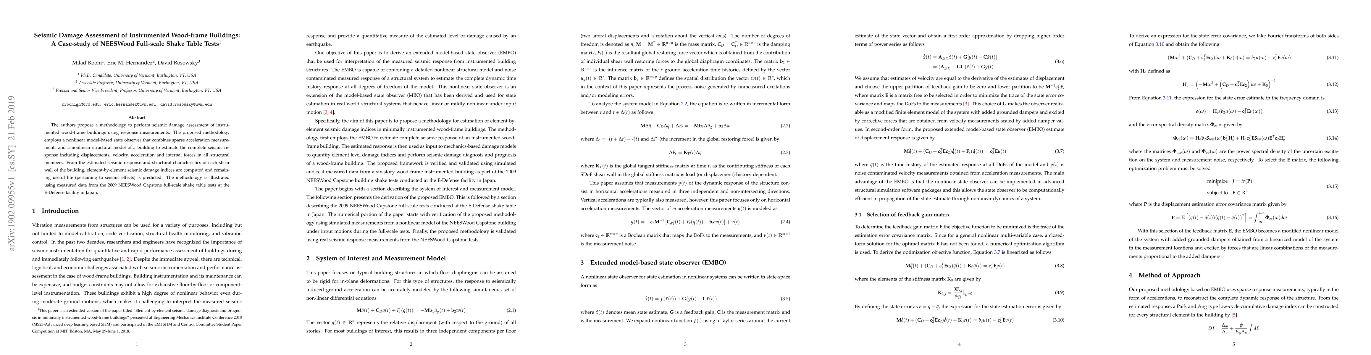 The authors propose a methodology to perform seismic damage assessment of instrumented wood-frame buildings using response measurements. The proposed methodology employs a nonlinear model-based state observer that combines sparse acceleration measurements and a nonlinear structural model of a building to estimate the complete seismic response including displacements, velocity, acceleration and internal forces in all structural members. From the estimated seismic response and structural characteristics of each shear wall of the building, element-by-element seismic damage indices are computed and remaining useful life (pertaining to seismic effects) is predicted. The methodology is illustrated using measured data from the 2009 NEESWood Capstone full-scale shake table tests at the E-Defense facility in Japan.