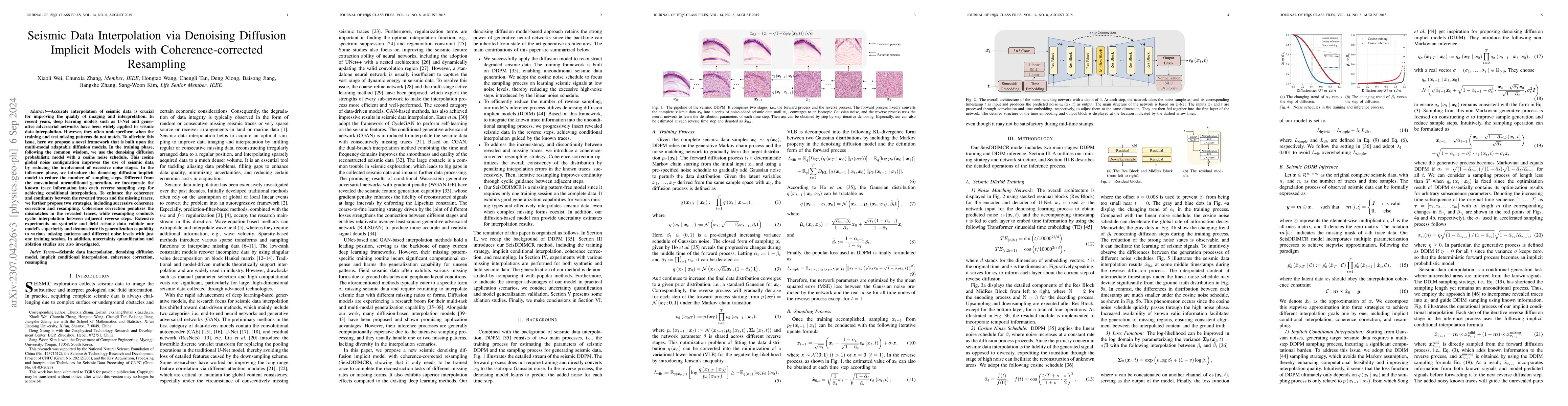 This paper proposes a novel seismic data interpolation method based on a denoising diffusion implicit model with resampling, addressing the issue of missing traces in seismic data. The model leverages a U-Net with multi-head self-attention and a cosine noise schedule for effective training, and uses a resampling strategy during inference to enhance coherence between known and missing traces, demonstrating superior performance and robustness in experiments.