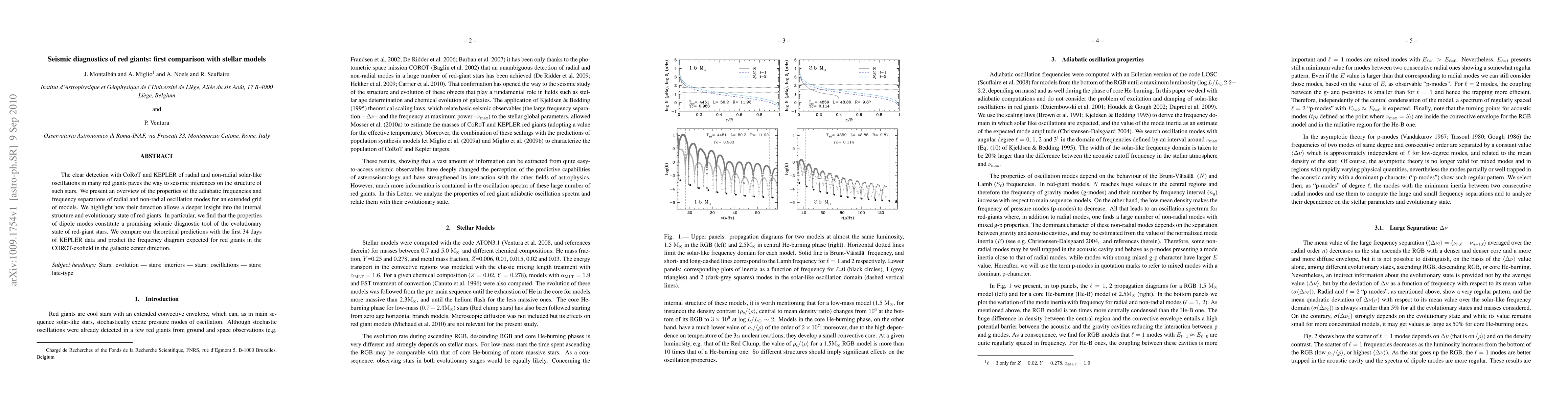 This paper uses CoRoT and KEPLER data to detect solar-like oscillations in red giants, providing insights into their internal structure and evolutionary state. The study finds that dipole modes are a promising diagnostic tool, comparing theoretical models with KEPLER data and predicting frequency diagrams for red giants in the COROT exofield.