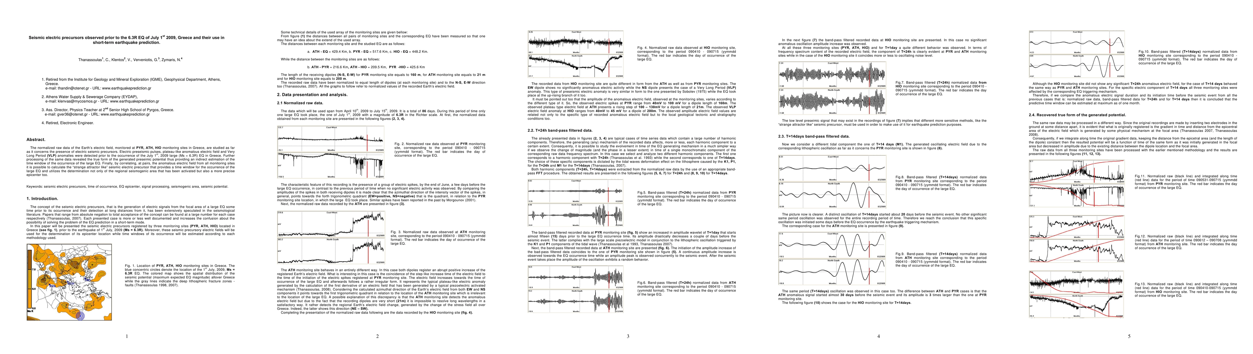 The normalized raw data of the Earth's electric field, monitored at PYR, ATH, HIO monitoring sites in Greece, are studied as far as it concerns the presence of electric seismic precursors. Electric preseismic pulses, plateau-like anomalous electric field and Very Long Period (VLP) anomalies were detected prior to the occurrence of the July 1st, 2009 large (Ms = 6.3R) EQ in Greece. Further processing of the same data revealed the true form of the generated preseimic potential thus providing an indirect estimation of the time window of the occurrence of the large EQ. Finally, by correlating, at pairs, the anomalous electric field from all monitoring sites it is possible to calculate the "strange attractor like" seismic electric precursor that provides a time window for the occurrence of the large EQ and utilizes the determination not only of the regional seismogenic area that has been activated but also a more precise epicenter too.