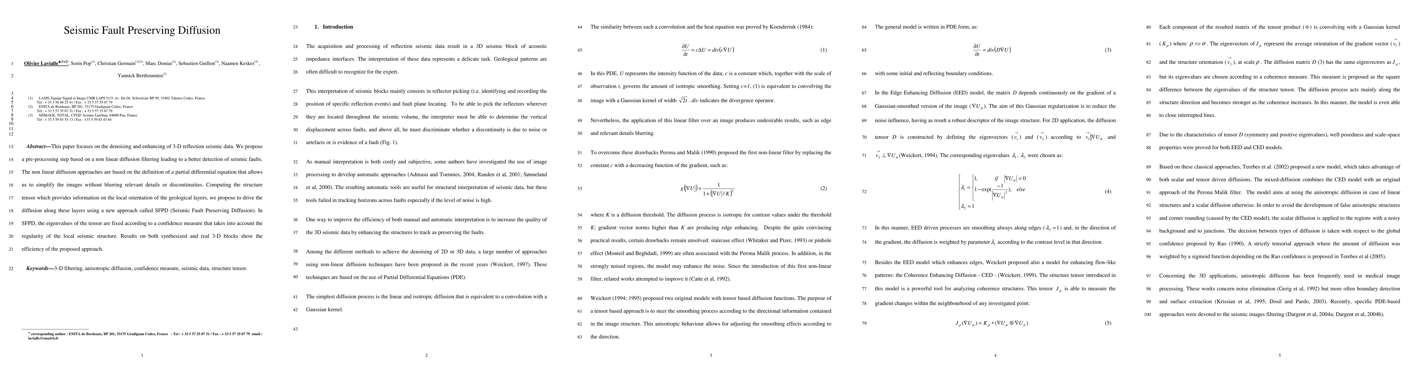 This paper introduces a non-linear diffusion filtering technique called Seismic Fault Preserving Diffusion (SFPD) to enhance 3-D seismic data, preserving fault details while denoising. The method uses a structure tensor to guide diffusion along geological layers, improving fault detection.