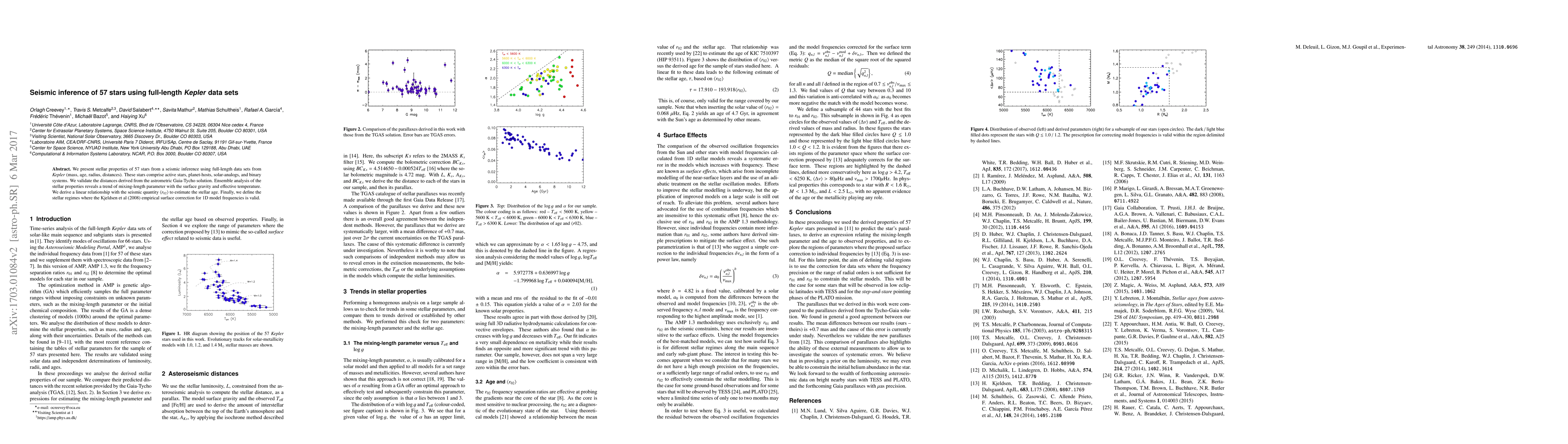 We present stellar properties (mass, age, radius, distances) of 57 stars from a seismic inference using full-length data sets from Kepler. These stars comprise active stars, planet-hosts, solar-analogs, and binary systems. We validate the distances derived from the astrometric Gaia-Tycho solution. Ensemble analysis of the stellar properties reveals a trend of mixing-length parameter with the surface gravity and effective temperature. We derive a linear relationship with the seismic quantity $\langle r_{02} \rangle$ to estimate the stellar age. Finally, we define the stellar regimes where the Kjeldsen et al (2008) empirical surface correction for 1D model frequencies is valid.
