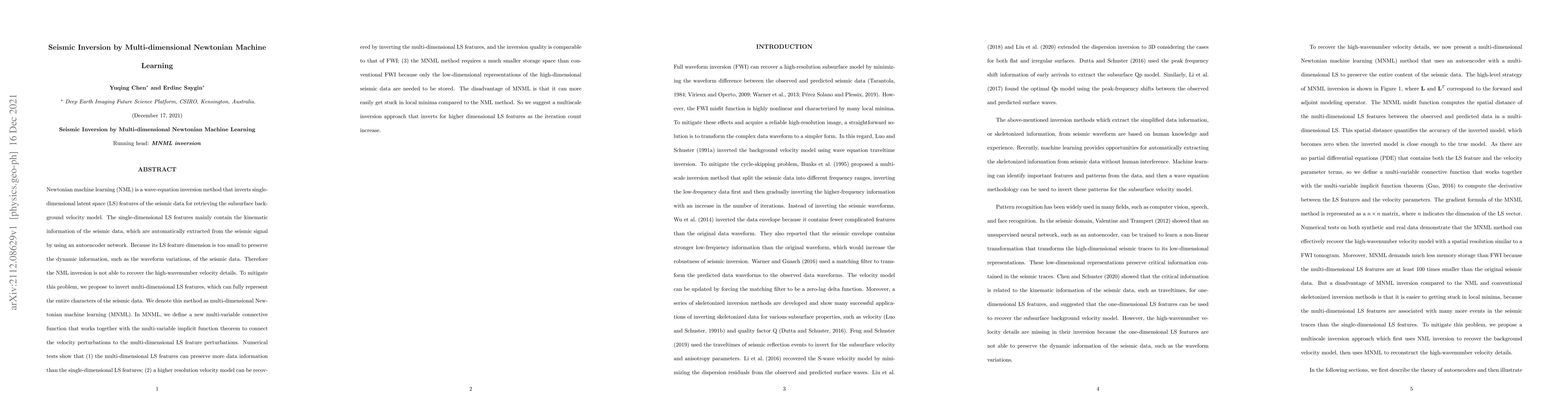 This paper proposes a multi-dimensional Newtonian machine learning (MNML) method to improve seismic inversion by inverting multi-dimensional latent space features, which better preserve seismic data information and recover higher resolution velocity models compared to single-dimensional inversion. However, MNML is prone to local minima, suggesting a multiscale inversion approach to mitigate this issue.