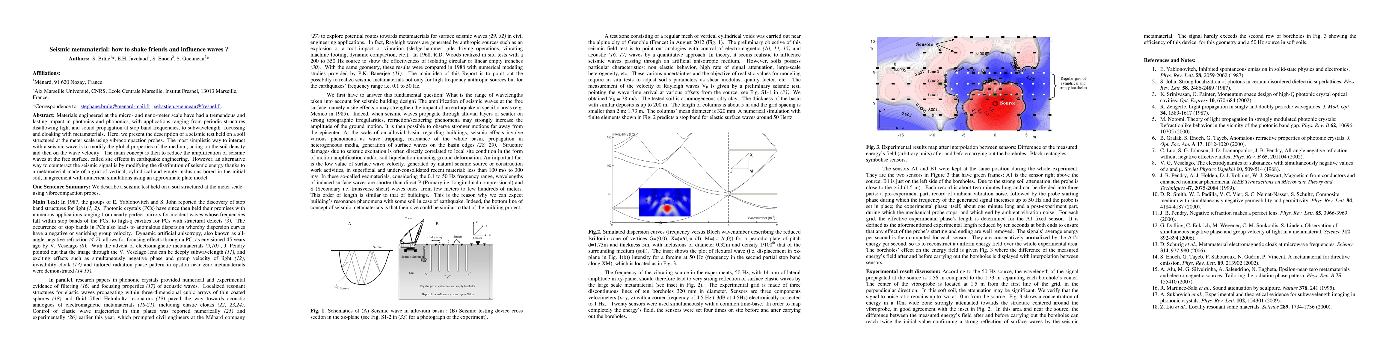 Materials engineered at the micro- and nano-meter scale have had a tremendous and lasting impact in photonics and phononics, with applications ranging from periodic structures disallowing light and sound propagation at stop band frequencies, to subwavelength focussing and cloaking with metamaterials. Here, we present the description of a seismic test held on a soil structured at the meter scale using vibrocompaction probes. The most simplistic way to interact with a seismic wave is to modify the global properties of the medium, acting on the soil density and then on the wave velocity. The main concept is then to reduce the amplification of seismic waves at the free surface, called site effects in earthquake engineering. However, an alternative way to counteract the seismic signal is by modifying the distribution of seismic energy thanks to a metamaterial made of a grid of vertical, cylindrical and empty inclusions bored in the initial soil, in agreement with numerical simulations using an approximate plate model.