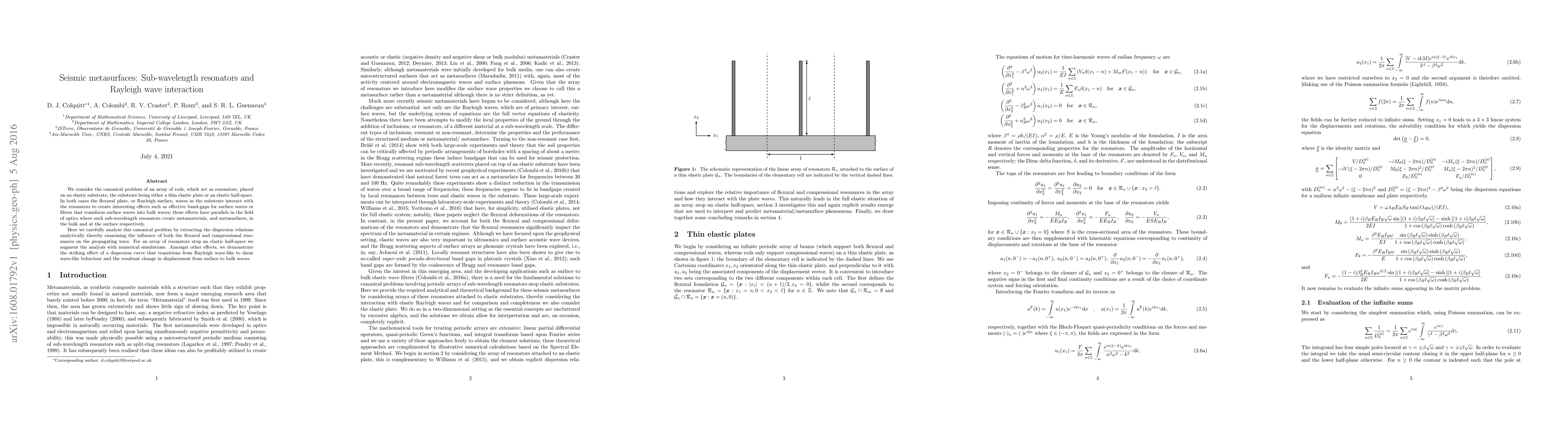We consider the canonical problem of an array of rods, which act as resonators, placed on an elastic substrate; the substrate being either a thin elastic plate or an elastic half-space. In both cases the flexural plate, or Rayleigh surface, waves in the substrate interact with the resonators to create interesting effects such as effective band-gaps for surface waves or filters that transform surface waves into bulk waves; these effects have parallels in the field of optics where such sub-wavelength resonators create metamaterials, and metasurfaces, in the bulk and at the surface respectively. Here we carefully analyse this canonical problem by extracting the dispersion relations analytically thereby examining the influence of both the flexural and compressional resonances on the propagating wave. For an array of resonators atop an elastic half-space we augment the analysis with numerical simulations. Amongst other effects, we demonstrate the striking effect of a dispersion curve that transitions from Rayleigh wave-like to shear wave-like behaviour and the resultant change in displacement from surface to bulk waves.
