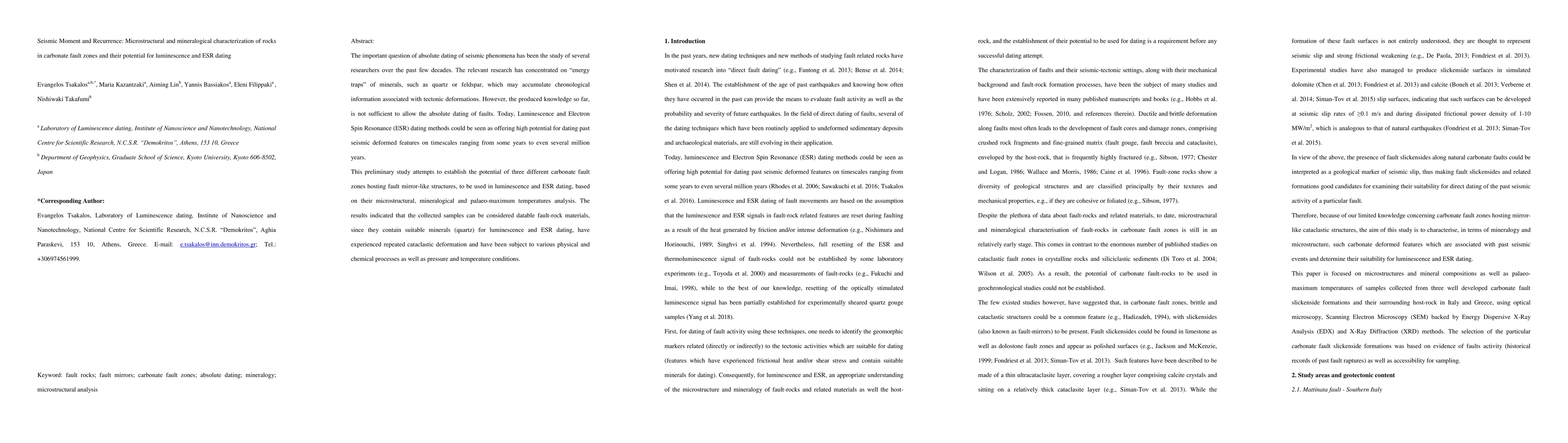 The important question of absolute dating of seismic phenomena has been the study of several researchers over the past few decades. The relevant research has concentrated on 'energy traps' of minerals, such as quartz or feldspar, which may accumulate chronological information associated with tectonic deformations. However, the produced knowledge so far, is not sufficient to allow the absolute dating of faults. Today, Luminescence and Electron Spin Resonance (ESR) dating methods could be seen as offering high potential for dating past seismic deformed features on timescales ranging from some years to even several million years. This preliminary study attempts to establish the potential of three different carbonate fault zones hosting fault mirror-like structures, to be used in luminescence and ESR dating, based on their microstructural, mineralogical and palaeo-maximum temperatures analysis. The results indicated that the collected samples can be considered datable fault-rock materials, since they contain suitable minerals (quartz) for luminescence and ESR dating, have experienced repeated cataclastic deformation and have been subject to various physical and chemical processes as well as pressure and temperature conditions.