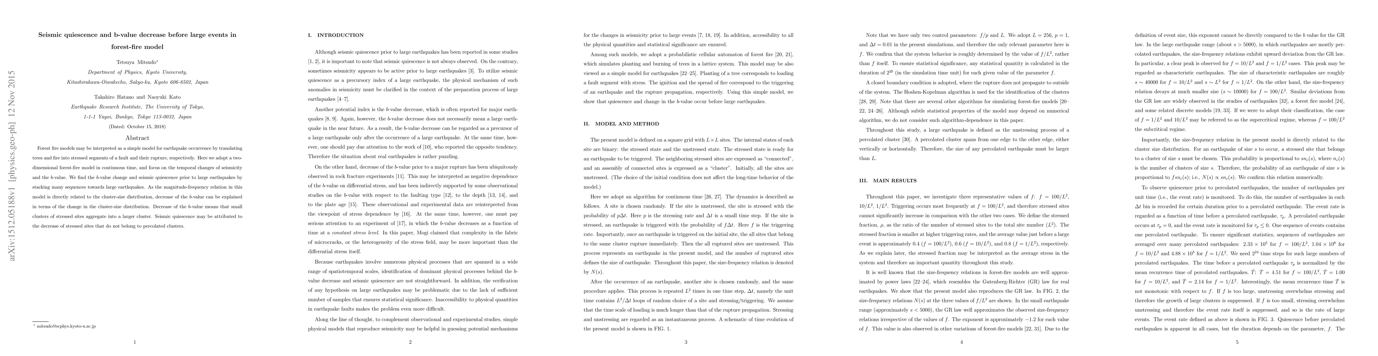 This paper uses a forest-fire model to simulate earthquake behavior, finding that seismic quiescence and a decrease in the b-value occur before large earthquakes. The decrease in the b-value indicates smaller clusters of stressed sites merging into larger clusters.