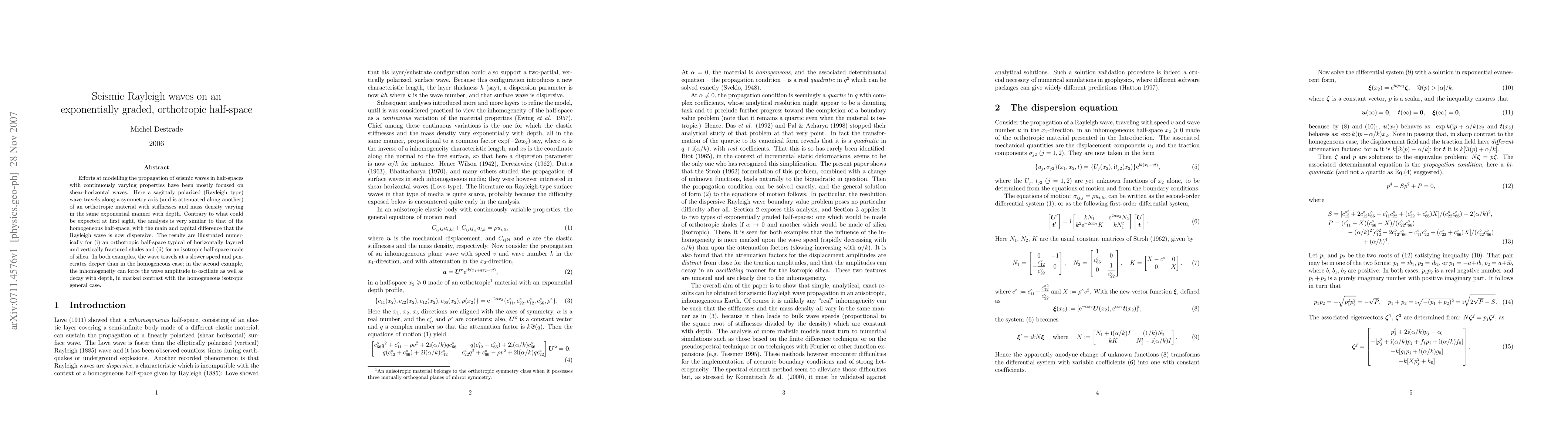 Seismic waves traveling through an exponentially graded, orthotropic half-space exhibit dispersion similar to homogeneous cases, but with slower speeds and deeper penetration; inhomogeneities can affect wave amplitude.