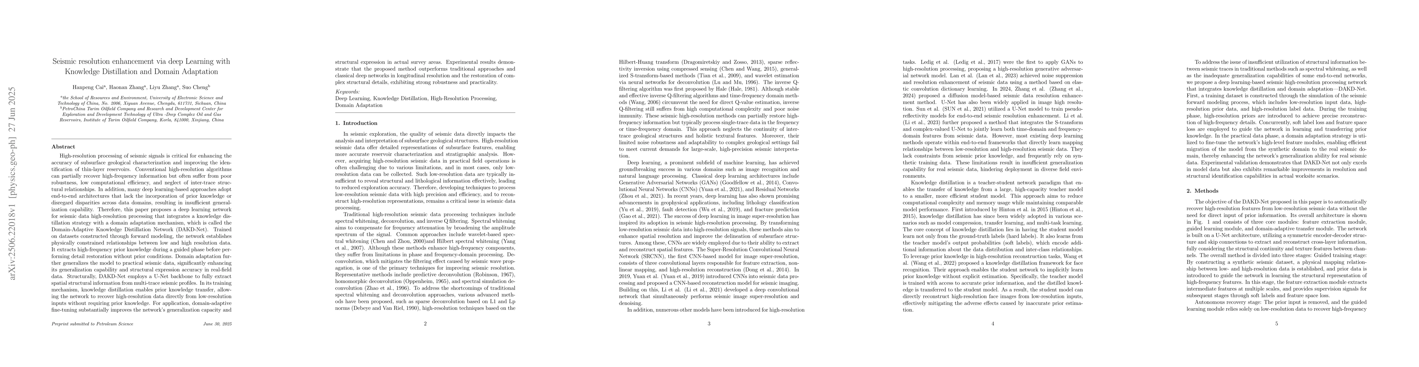 High-resolution processing of seismic signals is crucial for subsurface geological characterization and thin-layer reservoir identification. Traditional high-resolution algorithms can partially recover high-frequency information but often lack robustness, computational efficiency, and consideration of inter-trace structural relationships. Many deep learning methods use end-to-end architectures that do not incorporate prior knowledge or address data domain disparities, leading to limited generalization.To overcome these challenges, this paper presents the Domain-Adaptive Knowledge Distillation Network (DAKD-Net), which integrates a knowledge distillation strategy with a domain adaptation mechanism for high-resolution seismic data processing. Trained on datasets from forward modeling, DAKD-Net establishes physical relationships between low and high-resolution data, extracting high-frequency prior knowledge during a guided phase before detail restoration without prior conditions. Domain adaptation enhances the model's generalization to real seismic data, improving both generalization capability and structural expression accuracy.DAKD-Net employs a U-Net backbone to extract spatial structural information from multi-trace seismic profiles. The knowledge distillation mechanism enables prior knowledge transfer, allowing recovery of high-resolution data directly from low-resolution inputs. Domain-adaptive fine-tuning further enhances the network's performance in actual survey areas. Experimental results show that DAKD-Net outperforms traditional methods and classical deep networks in longitudinal resolution and complex structural detail restoration, demonstrating strong robustness and practicality.