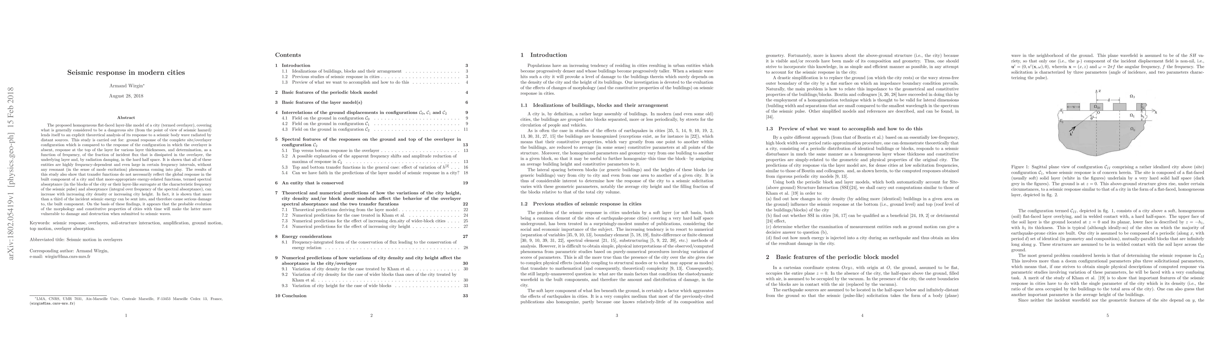 The proposed homogeneous flat-faced layer-like model of a city (termed overlayer), covering what is generally considered to be a dangerous site (from the point of view of seismic hazard) lends itself to an explicit theoretical analysis of its response to a seismic body wave radiated by distant sources. This study is carried out for: ground response of the complete site/overlayer configuration which is compared to the response of the configuration in which the overlayer is absent, response at the top of the layer for various layer thicknesses, and determination, as a function of frequency, of the fraction of incident flux that is dissipated in the overlayer, the underlying layer and, by radiation damping, in the hard half space. It is shown that all of these entities are highly frequency-dependent and even large in certain frequency intervals, without any resonant (in the sense of mode excitation) phenomena coming into play. The results of this study also show that transfer functions do not necessarily reflect the global response in the built component of a city and that more-appropriate energy-related functions, termed spectral absorptance (in the blocks of the city or their layer-like surrogate at the characteristic frequency of the seismic pulse) and absorptance (integral over frequency of the spectral absorptance), can increase with increasing city density or increasing city height. In fact, it is shown that more than a third of the incident seismic energy can be sent into, and therefore cause serious damage to, the built component. On the basis of these findings, it appears that the probable evolution of the morphology and constitutive properties of cities with time will make the latter more vulnerable to damage and destruction when submitted to seismic waves.