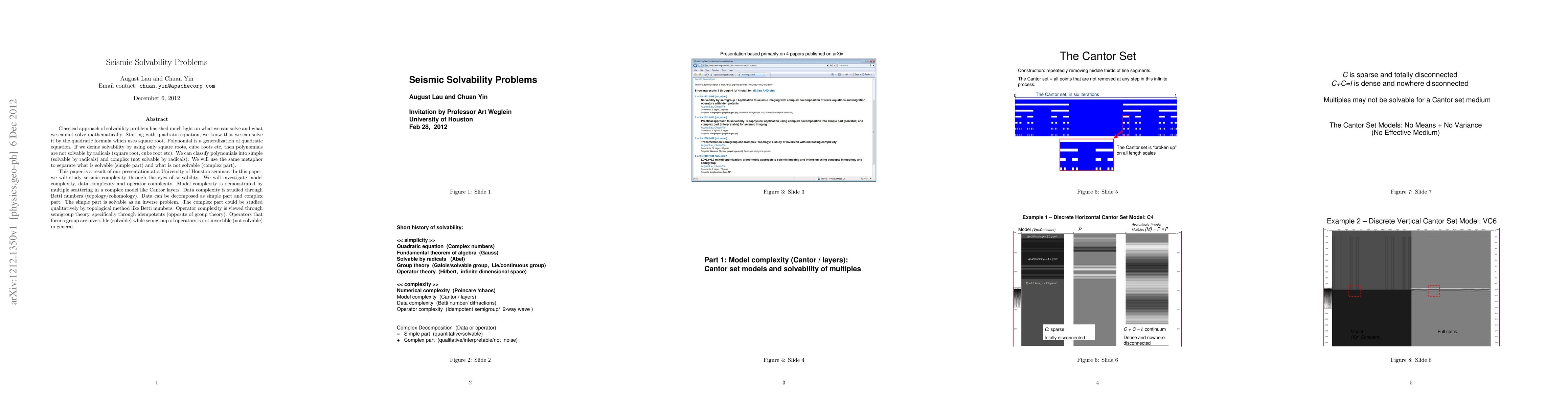 Classical approach of solvability problem has shed much light on what we can solve and what we cannot solve mathematically. Starting with quadratic equation, we know that we can solve it by the quadratic formula which uses square root. Polynomial is a generalization of quadratic equation. If we define solvability by using only square roots, cube roots etc, then polynomials are not solvable by radicals (square root, cube root etc). We can classify polynomials into simple (solvable by radicals) and complex (not solvable by radicals). We will use the same metaphor to separate what is solvable (simple part) and what is not solvable (complex part). This paper is a result of our presentation at a University of Houston seminar. In this paper, we will study seismic complexity through the eyes of solvability. We will investigate model complexity, data complexity and operator complexity. Model complexity is demonstrated by multiple scattering in a complex model like Cantor layers. Data complexity is studied through Betti numbers (topology/cohomology). Data can be decomposed as simple part and complex part. The simple part is solvable as an inverse problem. The complex part could be studied qualitatively by topological method like Betti numbers. Operator complexity is viewed through semigroup theory, specifically through idempotents (opposite of group theory). Operators that form a group are invertible (solvable) while semigroup of operators is not invertible (not solvable) in general.