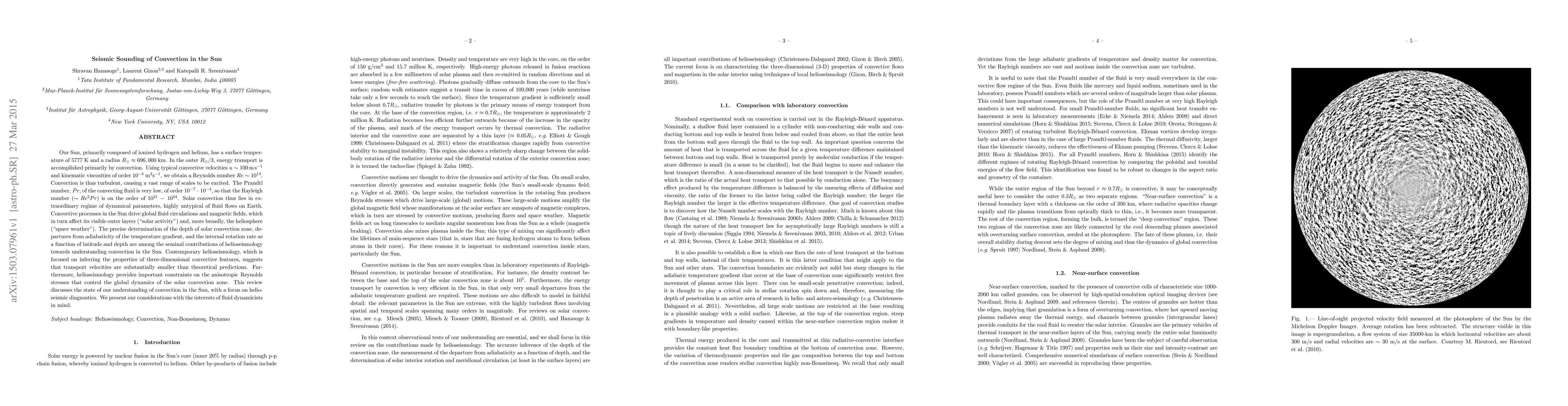 Our Sun, primarily composed of ionized hydrogen and helium, has a surface temperature of 5777~K and a radius $R_\odot \approx 696,000$ km. In the outer $R_\odot/3$, energy transport is accomplished primarily by convection. Using typical convective velocities $u\sim100\,\rm{m\,s^{-1}}$ and kinematic viscosities of order $10^{-4}$ m$^{2}$s$^{-1}$, we obtain a Reynolds number $Re \sim 10^{14}$. Convection is thus turbulent, causing a vast range of scales to be excited. The Prandtl number, $Pr$, of the convecting fluid is very low, of order $10^{-7}$\,--\,$10^{-4}$, so that the Rayleigh number ($\sim Re^2 Pr$) is on the order of $10^{21}\,-\,10^{24}$. Solar convection thus lies in extraordinary regime of dynamical parameters, highly untypical of fluid flows on Earth. Convective processes in the Sun drive global fluid circulations and magnetic fields, which in turn affect its visible outer layers ("solar activity") and, more broadly, the heliosphere ("space weather"). The precise determination of the depth of solar convection zone, departures from adiabaticity of the temperature gradient, and the internal rotation rate as a function of latitude and depth are among the seminal contributions of helioseismology towards understanding convection in the Sun. Contemporary helioseismology, which is focused on inferring the properties of three-dimensional convective features, suggests that transport velocities are substantially smaller than theoretical predictions. Furthermore, helioseismology provides important constraints on the anisotropic Reynolds stresses that control the global dynamics of the solar convection zone. This review discusses the state of our understanding of convection in the Sun, with a focus on helioseismic diagnostics. We present our considerations with the interests of fluid dynamicists in mind.