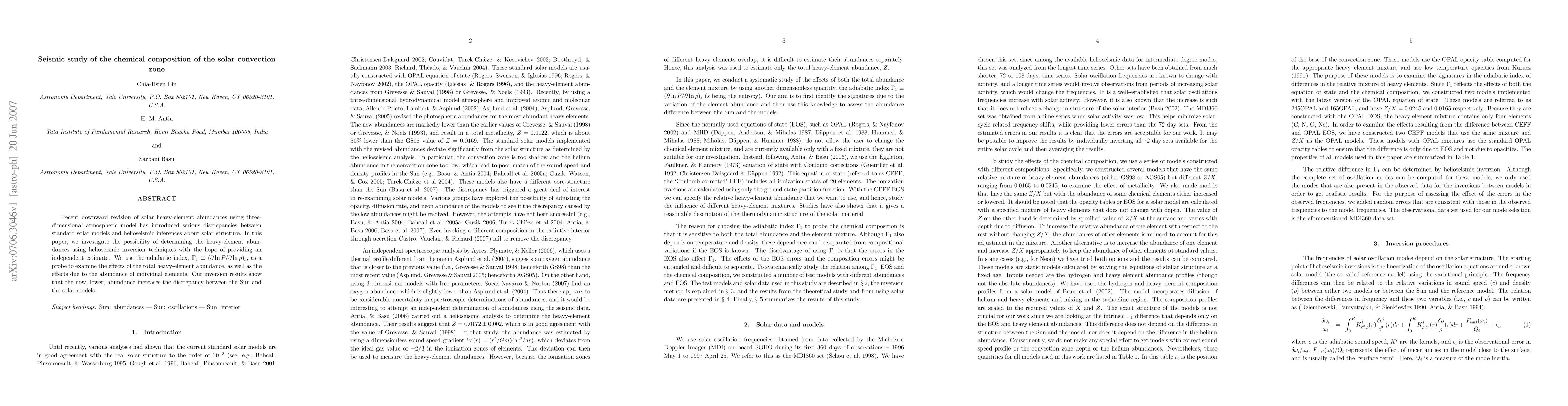 Recent downward revision of solar heavy-element abundances using three-dimensional atmospheric model has introduced serious discrepancies between standard solar models and helioseismic inferences about solar structure. In this paper, we investigate the possibility of determining the heavy-element abundances using helioseismic inversion techniques with the hope of providing an independent estimate. We use the adiabatic index, Gamma_1 (logarithmic partial derivative of pressure with respect to density at constant entropy) as a probe to examine the effects of the total heavy-element abundance, as well as the effects due to the abundance of individual elements. Our inversion results show that the new, lower, abundance increases the discrepancy between the Sun and the solar models.