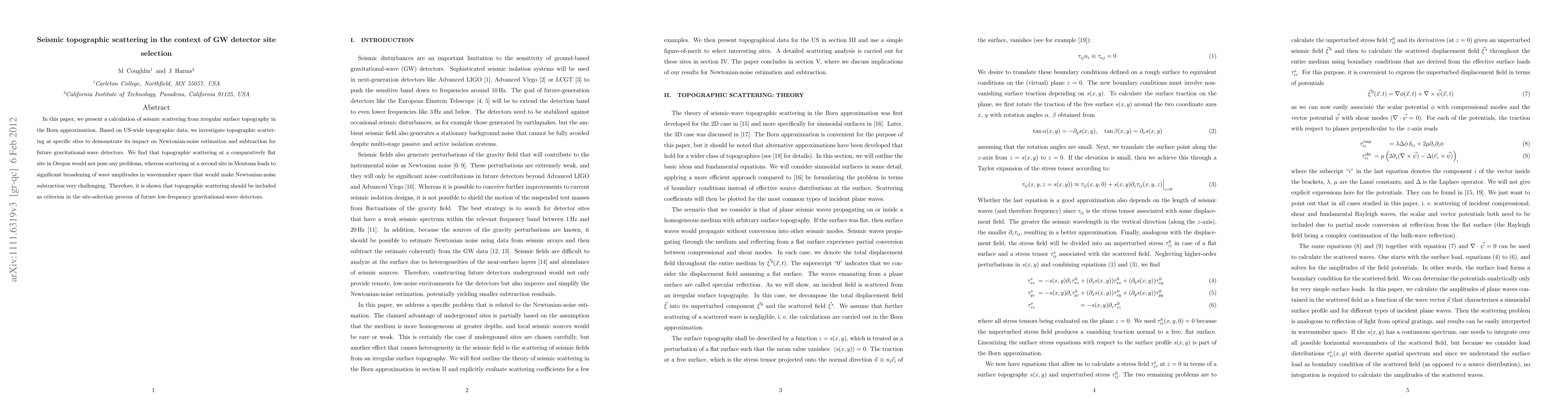 This paper calculates seismic scattering from irregular topography using the Born approximation, finding that while a flat site in Oregon poses no issues, a site in Montana experiences significant scattering, complicating Newtonian-noise subtraction. It concludes that topographic scattering should be a criterion in future gravitational-wave detector site selection.