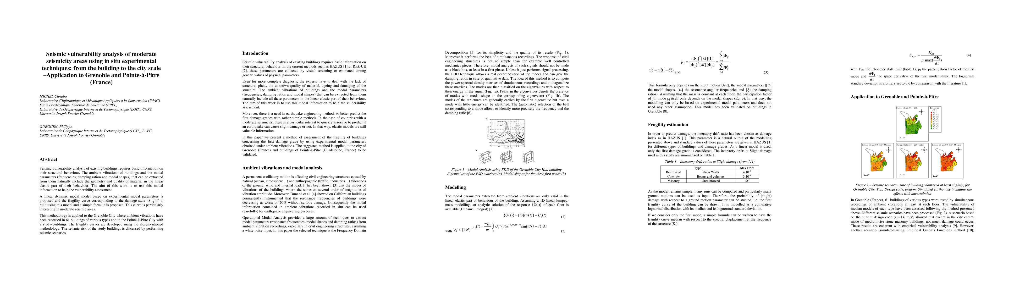 This paper proposes a linear dynamic modal model based on experimental modal parameters for seismic vulnerability analysis of buildings in moderate seismicity areas. The methodology is applied to Grenoble and Pointe-à-Pitre, France, with fragility curves developed for assessing seismic risk through ambient vibration recordings.