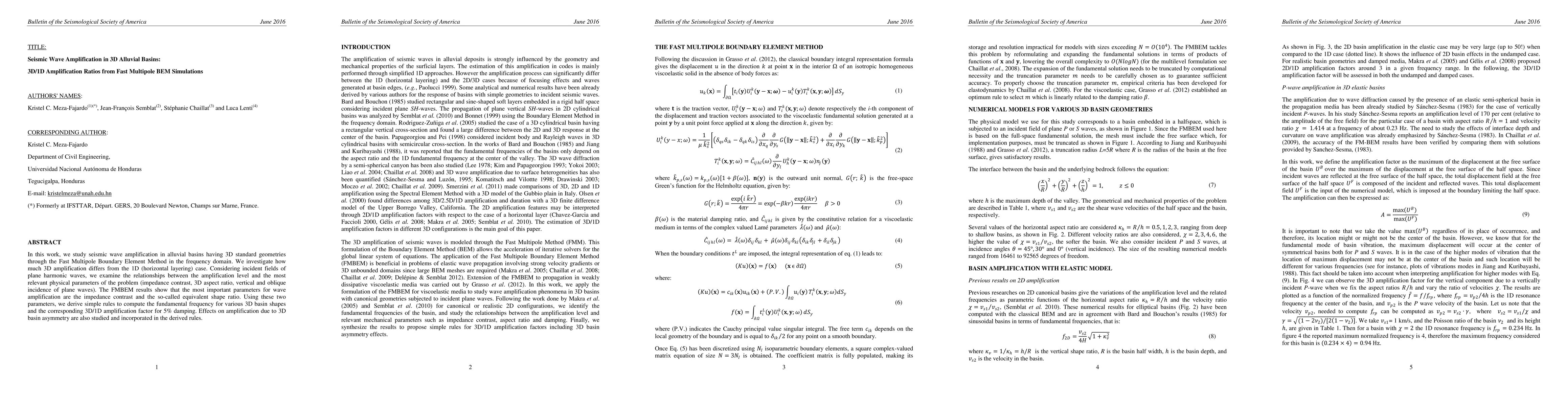This research investigates seismic wave amplification in 3D alluvial basins using the Fast Multipole Boundary Element Method, comparing 3D and 1D amplification ratios. Key findings highlight that impedance contrast and equivalent shape ratio are crucial for determining amplification, with derived rules for computing fundamental frequencies and 3D/1D amplification factors.