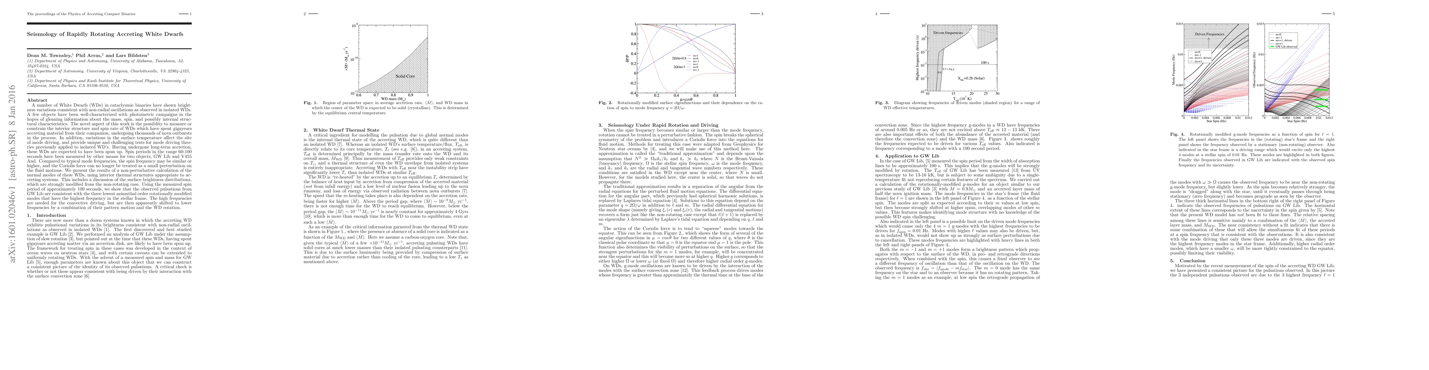 This paper investigates the seismology of rapidly rotating accreting white dwarfs (WDs) in cataclysmic binaries, focusing on non-radial oscillations and their implications for mass, spin rate, and internal structure. It demonstrates that the spin periods of accreting WDs, such as GW Lib and V455 And, are comparable to their pulsation frequencies, necessitating non-perturbative calculations to understand their normal modes and modified surface brightness distributions.