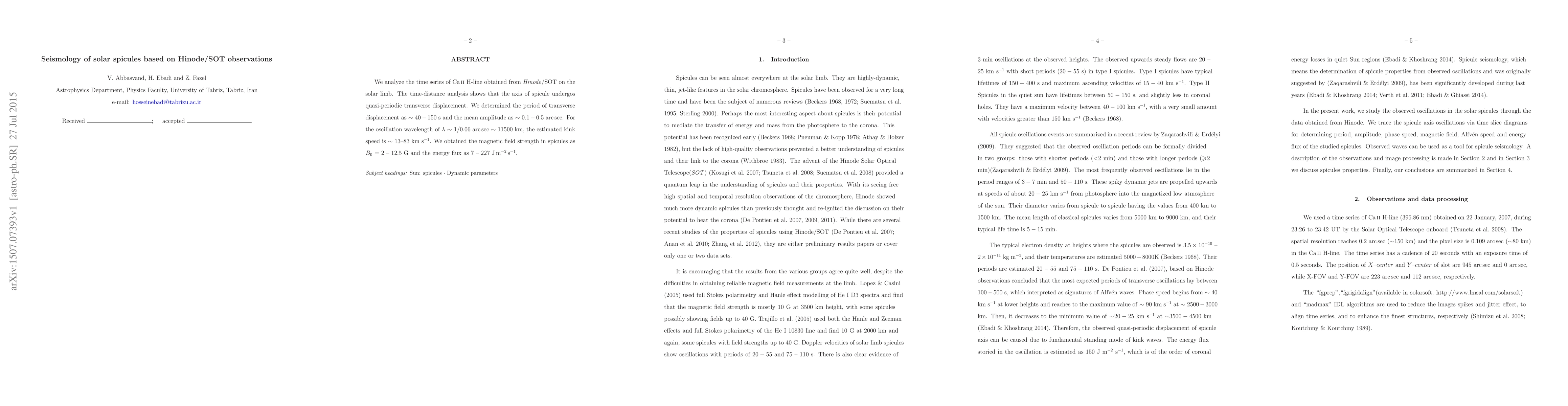 We analyze the time series of Ca ii H-line obtained from Hinode/SOT on the solar limb. The time-distance analysis shows that the axis of spicule undergoes quasi-periodic transverse displacement. We determined the period of transverse displacement as ~40-150 s and the mean amplitude as ~ 0.1-0.5 arcsec. For the oscillation wavelength of $\lambda$ ~ 1/0.06 arcsec ~ 11500 km, the estimated kink speed is ~ 13-83 km/s. We obtained the magnetic field strength in spicules as B_0 = 2 - 12.5 G and the energy flux as 7 - 227 J/m^-2s.