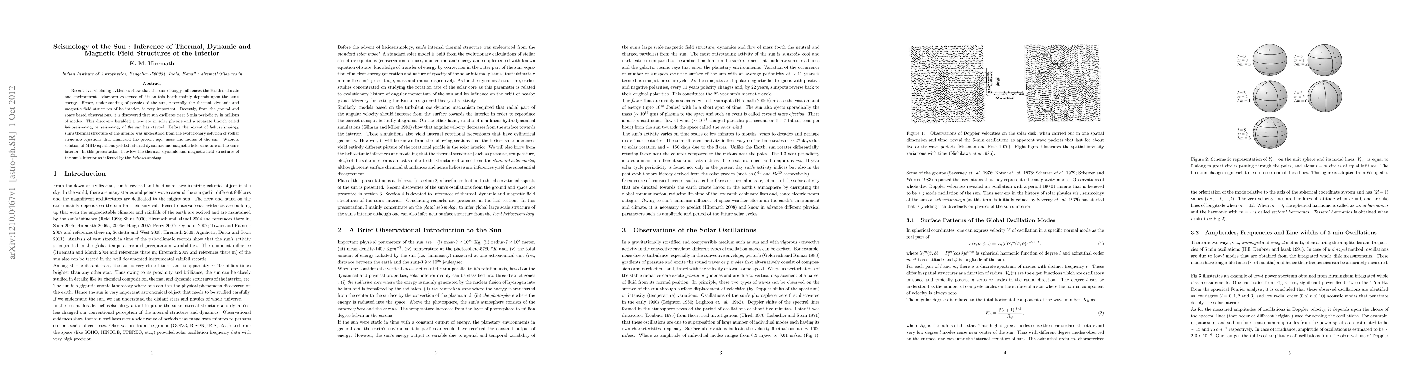 Recent overwhelming evidences show that the sun strongly influences the Earth's climate and environment. Moreover existence of life on this Earth mainly depends upon the sun's energy. Hence, understanding of physics of the sun, especially the thermal, dynamic and magnetic field structures of its interior, is very important. Recently, from the ground and space based observations, it is discovered that sun oscillates near 5 min periodicity in millions of modes. This discovery heralded a new era in solar physics and a separate branch called helioseismology or seismology of the sun has started. Before the advent of helioseismology, sun's thermal structure of the interior was understood from the evolutionary solution of stellar structure equations that mimicked the present age, mass and radius of the sun. Whereas solution of MHD equations yielded internal dynamics and magnetic field structure of the sun's interior. In this presentation, I review the thermal, dynamic and magnetic field structures of the sun's interior as inferred by the helioseismology.