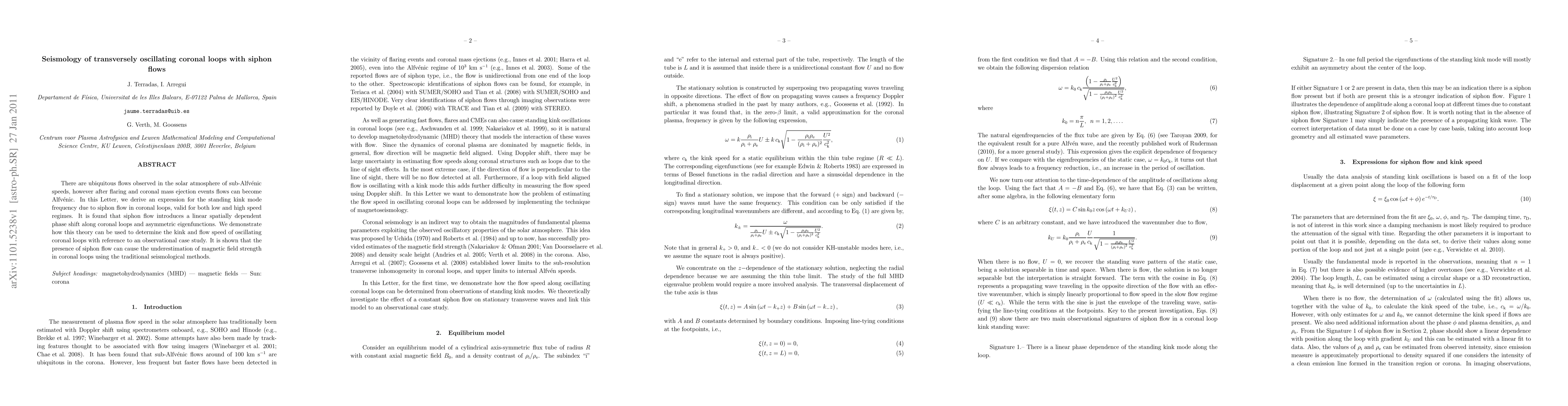This paper derives an expression for the standing kink mode frequency in coronal loops due to siphon flows, showing that these flows introduce a spatially dependent phase shift and asymmetric eigenfunctions. The study demonstrates how this theory can be applied to observational data to determine loop oscillations and flow speeds, highlighting potential underestimations of magnetic field strength using traditional methods.