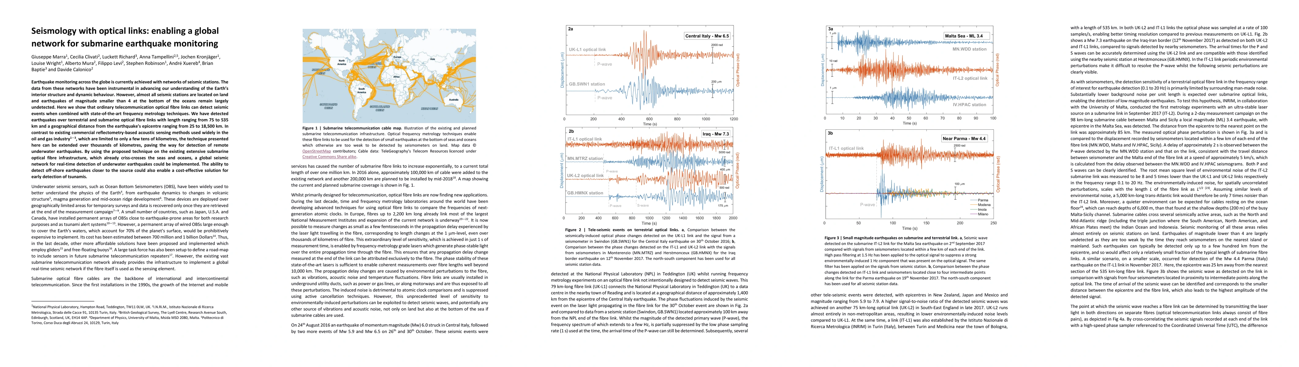 Earthquake monitoring across the globe is currently achieved with networks of seismic stations. The data from these networks have been instrumental in advancing our understanding of the Earth's interior structure and dynamic behaviour. However, almost all seismic stations are located on land and earthquakes of magnitude smaller than 4 at the bottom of the oceans remain largely undetected. Here we show that ordinary telecommunication optical fibre links can detect seismic events when combined with state-of-the-art frequency metrology techniques. We have detected earthquakes over terrestrial and submarine optical fibre links with length ranging from 75 to 535 km and a geographical distance from the earthquake's epicentre ranging from 25 to 18,500 km. In contrast to existing commercial reflectometry-based acoustic sensing methods used widely in the oil and gas industry, which are limited to only a few tens of kilometres, the technique presented here can be extended over thousands of kilometres, paving the way for detection of remote underwater earthquakes. By using the proposed technique on the existing extensive submarine optical fibre infrastructure, which already criss-crosses the seas and oceans, a global seismic network for real-time detection of underwater earthquakes could be implemented. The ability to detect off-shore earthquakes closer to the source could also enable a cost-effective solution for early detection of tsunamis.