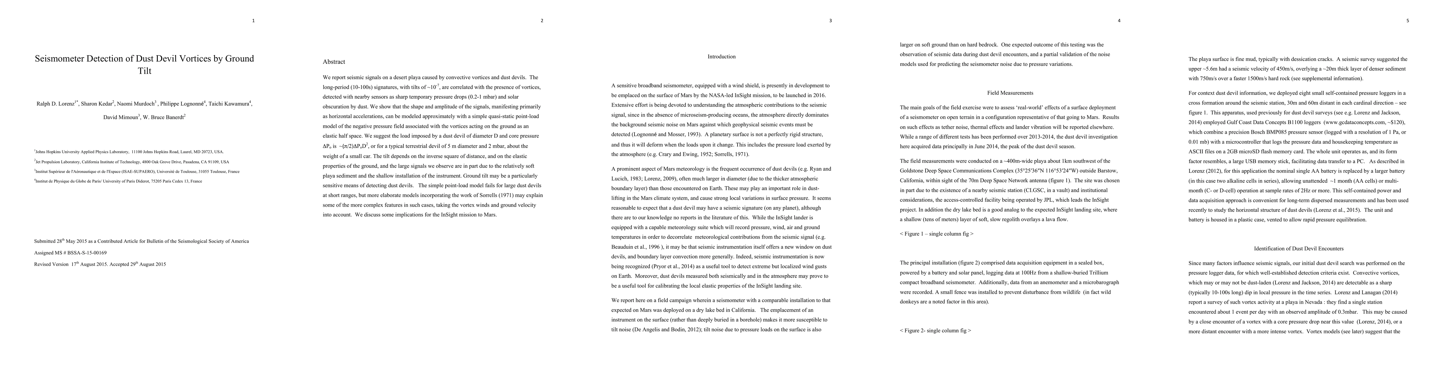 This paper reports seismic signals detected by a seismometer on a desert playa, correlating long-period ground tilts with the presence of dust devils. The study suggests that the ground tilt can be modeled by a quasi-static point-load model, indicating that dust devils exert a load comparable to the weight of a small car, making ground tilt a sensitive detection method for these vortices.