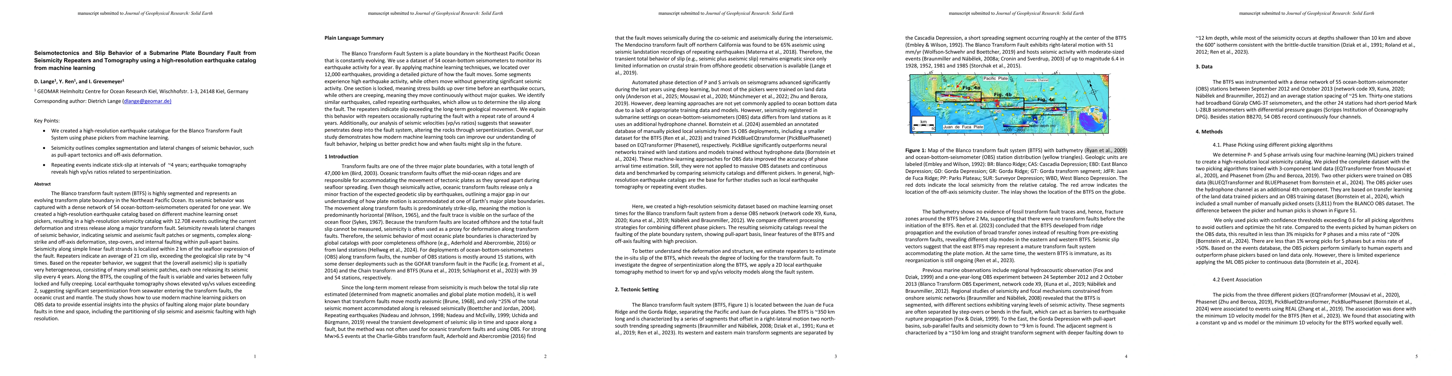 The study utilized a dense network of 54 ocean-bottom seismometers (OBS) for one year to capture the seismic behavior of the Blanco transform fault system (BTFS). Machine learning phase pickers were applied to create a high-resolution earthquake catalog, revealing detailed deformation of the transform fault system.