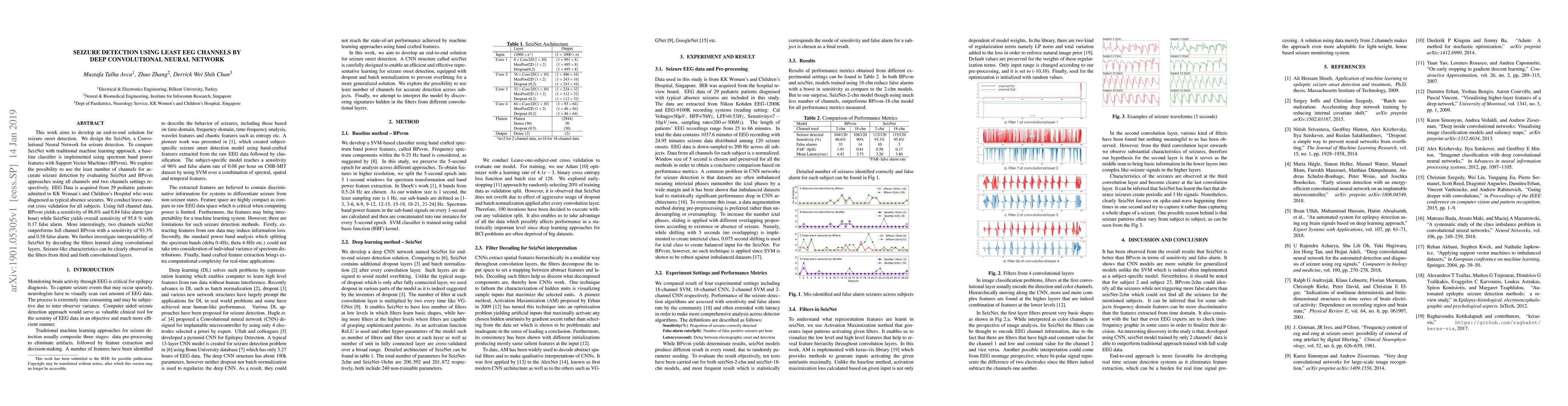 This work aims to develop an end-to-end solution for seizure onset detection. We design the SeizNet, a Convolutional Neural Network for seizure detection. To compare SeizNet with traditional machine learning approach, a baseline classifier is implemented using spectrum band power features with Support Vector Machines (BPsvm). We explore the possibility to use the least number of channels for accurate seizure detection by evaluating SeizNet and BPsvm approaches using all channels and two channels settings respectively. EEG Data is acquired from 29 pediatric patients admitted to KK Woman's and Children's Hospital who were diagnosed as typical absence seizures. We conduct leave-one-out cross validation for all subjects. Using full channel data, BPsvm yields a sensitivity of 86.6\% and 0.84 false alarm (per hour) while SeizNet yields overall sensitivity of 95.8 \% with 0.17 false alarm. More interestingly, two channels seizNet outperforms full channel BPsvm with a sensitivity of 93.3\% and 0.58 false alarm. We further investigate interpretability of SeizNet by decoding the filters learned along convolutional layers. Seizure-like characteristics can be clearly observed in the filters from third and forth convolutional layers.