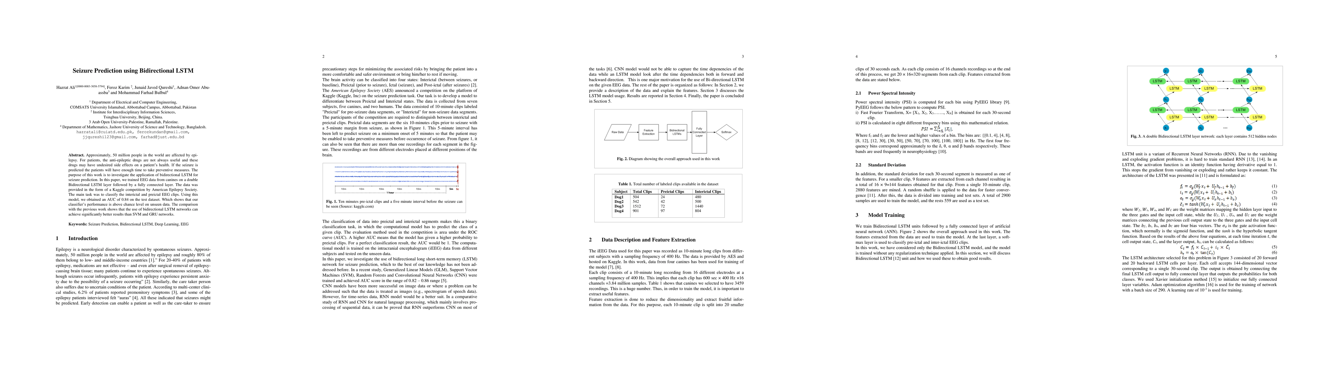 Approximately, 50 million people in the world are affected by epilepsy. For patients, the anti-epileptic drugs are not always useful and these drugs may have undesired side effects on a patient's health. If the seizure is predicted the patients will have enough time to take preventive measures. The purpose of this work is to investigate the application of bidirectional LSTM for seizure prediction. In this paper, we trained EEG data from canines on a double Bidirectional LSTM layer followed by a fully connected layer. The data was provided in the form of a Kaggle competition by American Epilepsy Society. The main task was to classify the interictal and preictal EEG clips. Using this model, we obtained an AUC of 0.84 on the test dataset. Which shows that our classifier's performance is above chance level on unseen data. The comparison with the previous work shows that the use of bidirectional LSTM networks can achieve significantly better results than SVM and GRU networks.