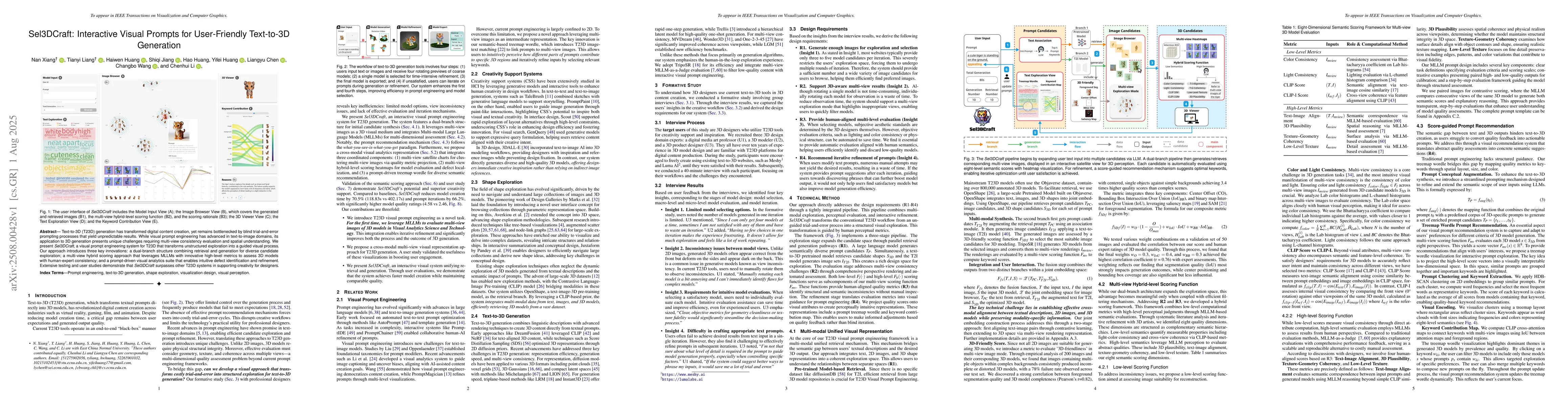Text-to-3D (T23D) generation has transformed digital content creation, yet remains bottlenecked by blind trial-and-error prompting processes that yield unpredictable results. While visual prompt engineering has advanced in text-to-image domains, its application to 3D generation presents unique challenges requiring multi-view consistency evaluation and spatial understanding. We present Sel3DCraft, a visual prompt engineering system for T23D that transforms unstructured exploration into a guided visual process. Our approach introduces three key innovations: a dual-branch structure combining retrieval and generation for diverse candidate exploration; a multi-view hybrid scoring approach that leverages MLLMs with innovative high-level metrics to assess 3D models with human-expert consistency; and a prompt-driven visual analytics suite that enables intuitive defect identification and refinement. Extensive testing and user studies demonstrate that Sel3DCraft surpasses other T23D systems in supporting creativity for designers.