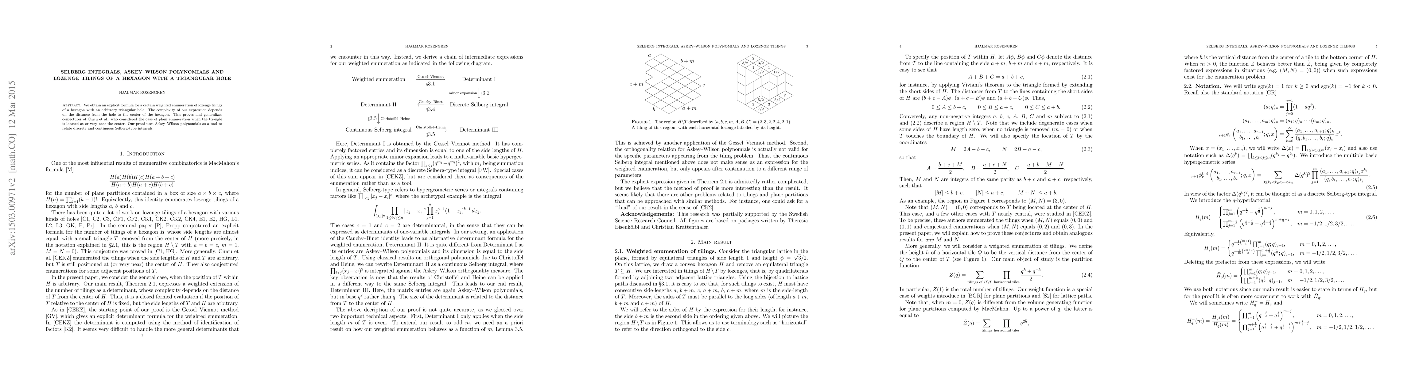 This paper provides an explicit formula for the weighted enumeration of lozenge tilings in a hexagon with a triangular hole, generalizing previous conjectures. The proof leverages Askey-Wilson polynomials to connect discrete and continuous Selberg-type integrals.