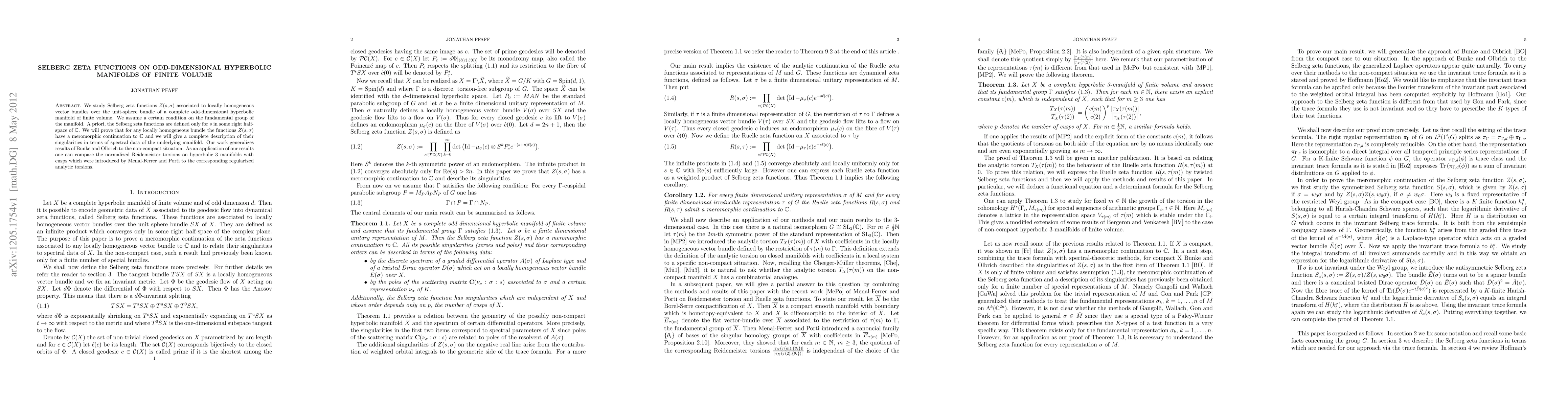 This paper studies Selberg zeta functions for vector bundles over odd-dimensional hyperbolic manifolds of finite volume, proving their meromorphic continuation to the entire complex plane and describing their singularities in terms of the manifold's spectral data. This generalizes prior work and allows for a comparison between normalized Reidemeister torsions and analytic torsions in hyperbolic 3-manifolds.