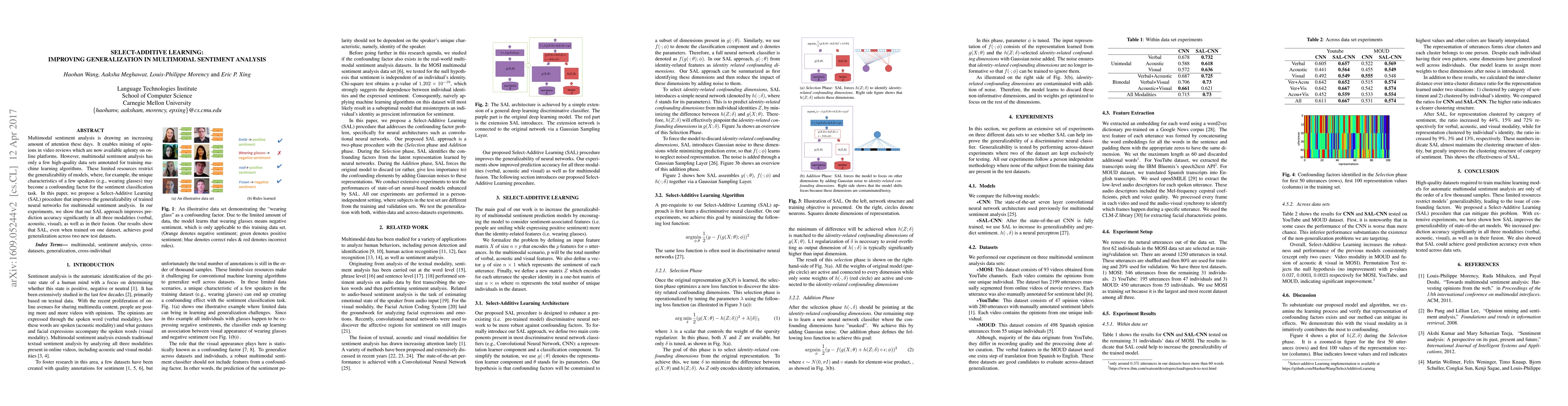 Multimodal sentiment analysis is drawing an increasing amount of attention these days. It enables mining of opinions in video reviews which are now available aplenty on online platforms. However, multimodal sentiment analysis has only a few high-quality data sets annotated for training machine learning algorithms. These limited resources restrict the generalizability of models, where, for example, the unique characteristics of a few speakers (e.g., wearing glasses) may become a confounding factor for the sentiment classification task. In this paper, we propose a Select-Additive Learning (SAL) procedure that improves the generalizability of trained neural networks for multimodal sentiment analysis. In our experiments, we show that our SAL approach improves prediction accuracy significantly in all three modalities (verbal, acoustic, visual), as well as in their fusion. Our results show that SAL, even when trained on one dataset, achieves good generalization across two new test datasets.