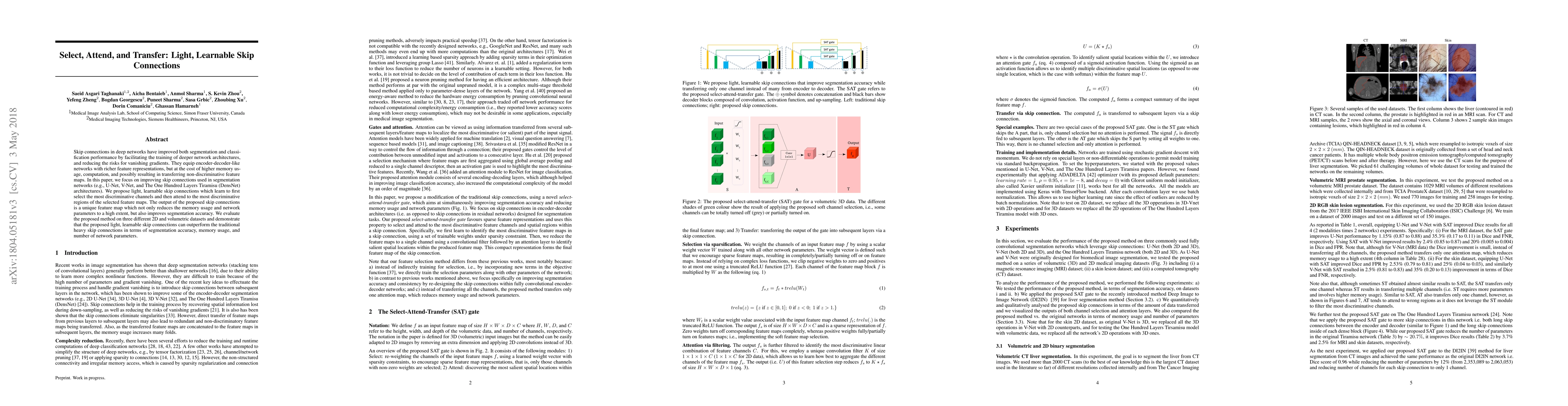 Skip connections in deep networks have improved both segmentation and classification performance by facilitating the training of deeper network architectures, and reducing the risks for vanishing gradients. They equip encoder-decoder-like networks with richer feature representations, but at the cost of higher memory usage, computation, and possibly resulting in transferring non-discriminative feature maps. In this paper, we focus on improving skip connections used in segmentation networks (e.g., U-Net, V-Net, and The One Hundred Layers Tiramisu (DensNet) architectures). We propose light, learnable skip connections which learn to first select the most discriminative channels and then attend to the most discriminative regions of the selected feature maps. The output of the proposed skip connections is a unique feature map which not only reduces the memory usage and network parameters to a high extent, but also improves segmentation accuracy. We evaluate the proposed method on three different 2D and volumetric datasets and demonstrate that the proposed light, learnable skip connections can outperform the traditional heavy skip connections in terms of segmentation accuracy, memory usage, and number of network parameters.