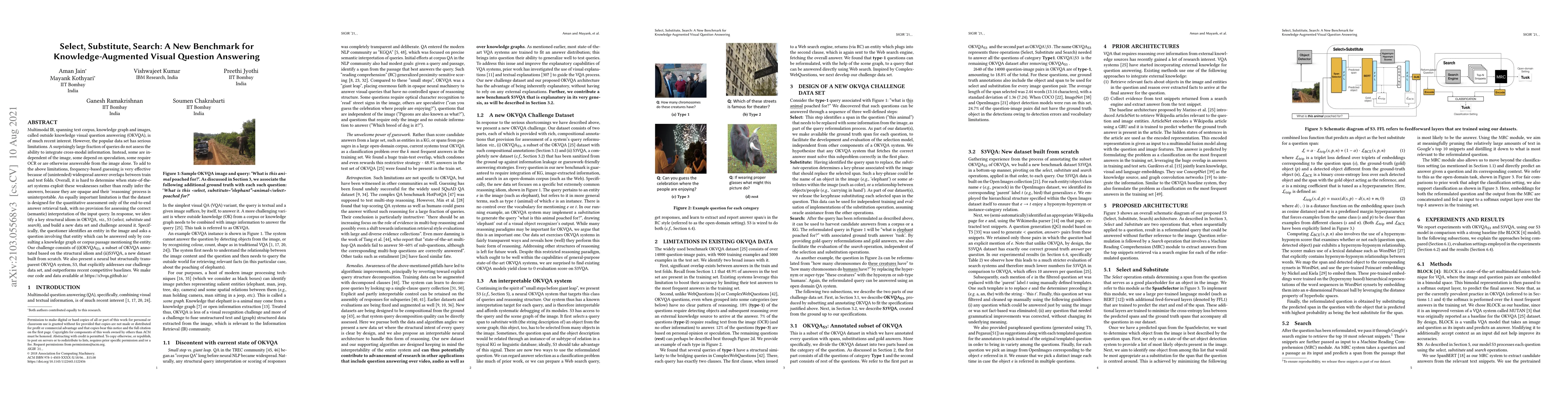 Multimodal IR, spanning text corpus, knowledge graph and images, called outside knowledge visual question answering (OKVQA), is of much recent interest. However, the popular data set has serious limitations. A surprisingly large fraction of queries do not assess the ability to integrate cross-modal information. Instead, some are independent of the image, some depend on speculation, some require OCR or are otherwise answerable from the image alone. To add to the above limitations, frequency-based guessing is very effective because of (unintended) widespread answer overlaps between the train and test folds. Overall, it is hard to determine when state-of-the-art systems exploit these weaknesses rather than really infer the answers, because they are opaque and their 'reasoning' process is uninterpretable. An equally important limitation is that the dataset is designed for the quantitative assessment only of the end-to-end answer retrieval task, with no provision for assessing the correct(semantic) interpretation of the input query. In response, we identify a key structural idiom in OKVQA ,viz., S3 (select, substitute and search), and build a new data set and challenge around it. Specifically, the questioner identifies an entity in the image and asks a question involving that entity which can be answered only by consulting a knowledge graph or corpus passage mentioning the entity. Our challenge consists of (i)OKVQAS3, a subset of OKVQA annotated based on the structural idiom and (ii)S3VQA, a new dataset built from scratch. We also present a neural but structurally transparent OKVQA system, S3, that explicitly addresses our challenge dataset, and outperforms recent competitive baselines.