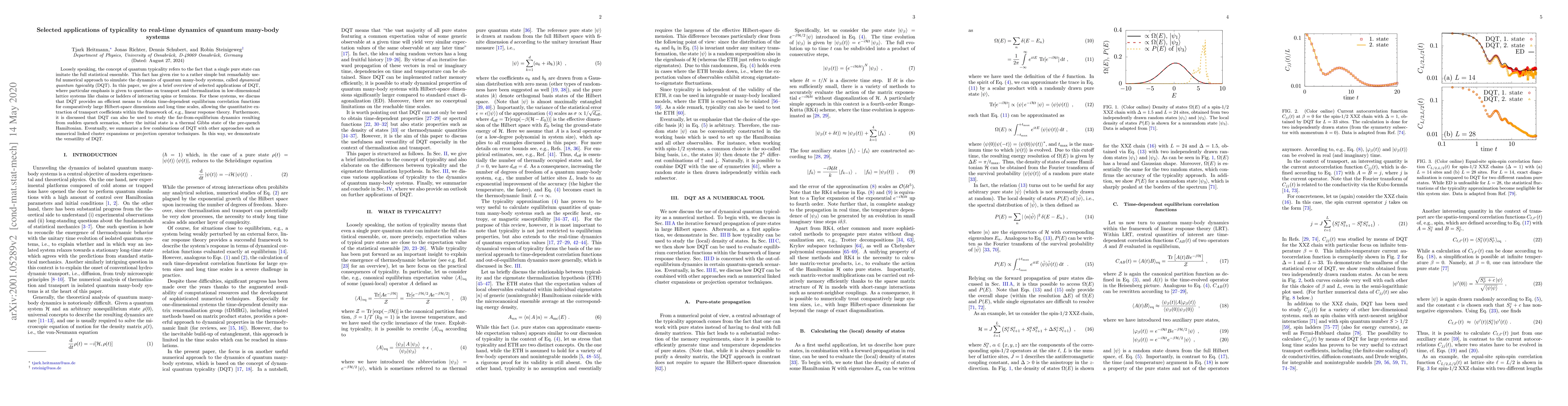 This paper reviews the applications of dynamical quantum typicality (DQT) in simulating the real-time dynamics of quantum many-body systems, focusing on transport and thermalization in low-dimensional lattice systems. DQT efficiently provides time-dependent equilibrium correlation functions, enabling the extraction of transport coefficients and studying far-from-equilibrium dynamics post-quench.