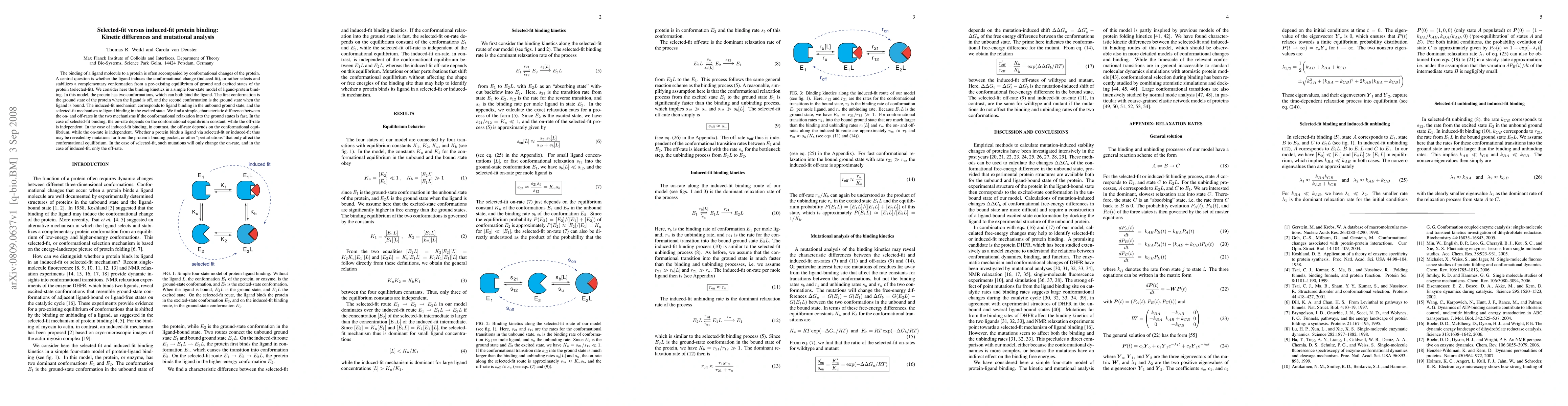 This paper explores the kinetic differences between selected-fit and induced-fit protein binding mechanisms using a four-state model. It finds that selected-fit binding alters the on-rate while induced-fit binding affects the off-rate, suggesting that mutational analysis can reveal the binding mechanism.