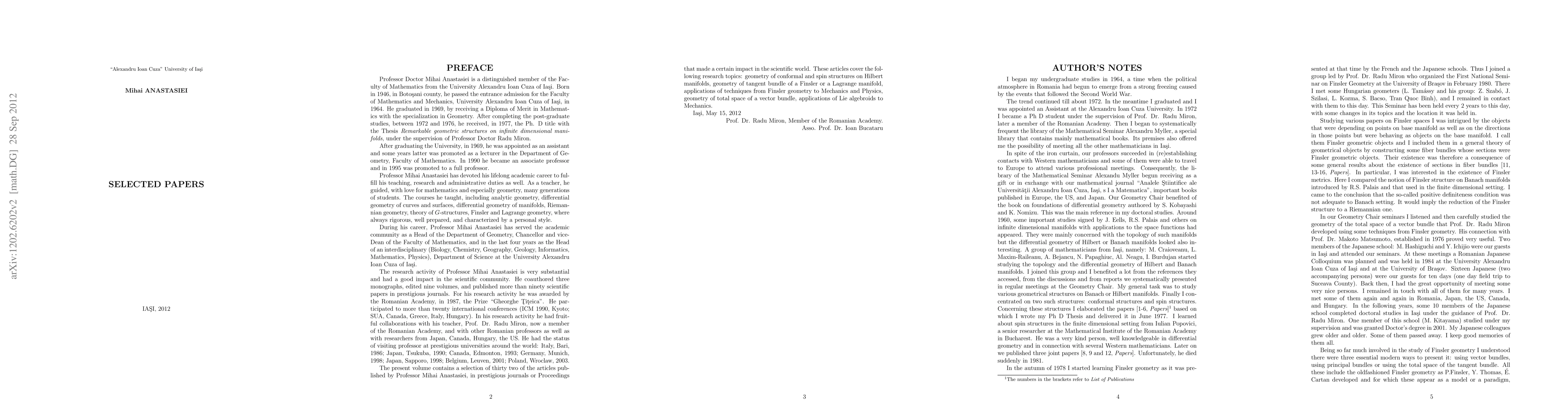 Before retiring, looking back to forty years of writing and publishing scientific papers, I decided to present to the scientific community a selection of my scientific works. I chose mostly articles published in prestigious journals or Proceedings that made a certain impact in the scientific world. I have selected thirty two out of some ninety papers, on the following subjects :Geometry of conformal and spin structures on Hilbert manifolds,Geometry of tangent bundle of a Finsler or a Lagrange manifold,Applications of techniques from Finsler geometry to Mechanics and Physics, Geometry of total space of a vector bundle, Applications of Lie algebroids to Mechanics