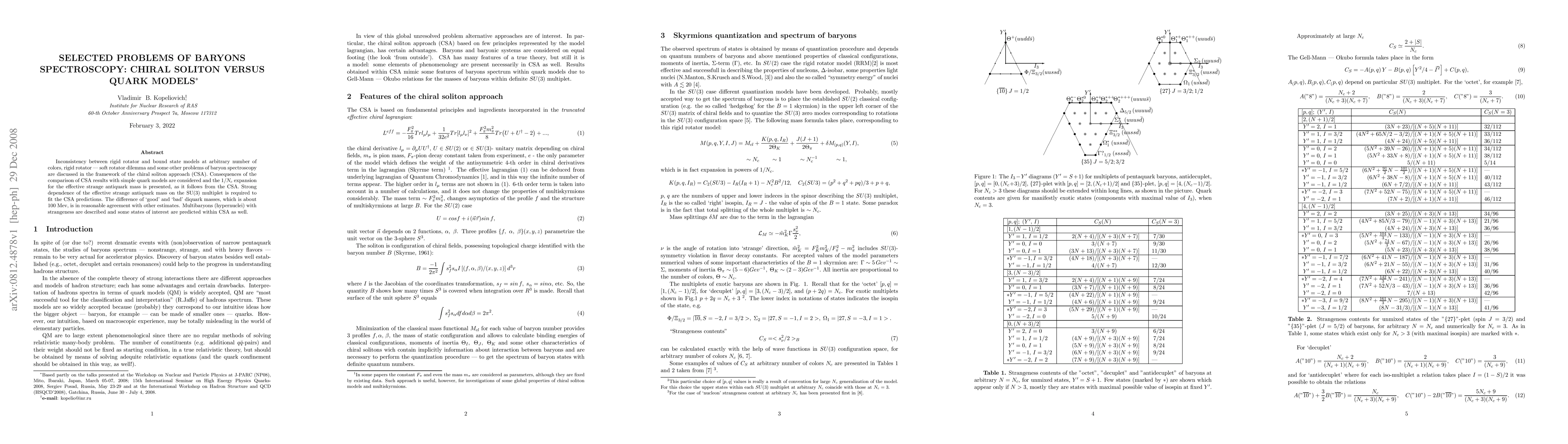 Inconsistency between rigid rotator and bound state models at arbitrary number of colors, rigid rotator -- soft rotator dilemma and some other problems of baryon spectroscopy are discussed in the framework of the chiral soliton approach (CSA). Consequences of the comparison of CSA results with simple quark models are considered and the $1/N_c$ expansion for the effective strange antiquark mass is presented, as it follows from the CSA. Strong dependence of the effective strange antiquark mass on the SU(3) multiplet is required to fit the CSA predictions. The difference of `good' and `bad' diquark masses, which is about 100 Mev, is in reasonable agreement with other estimates. Multibaryons (hypernuclei) with strangeness are described and some states of interest are predicted within CSA as well.