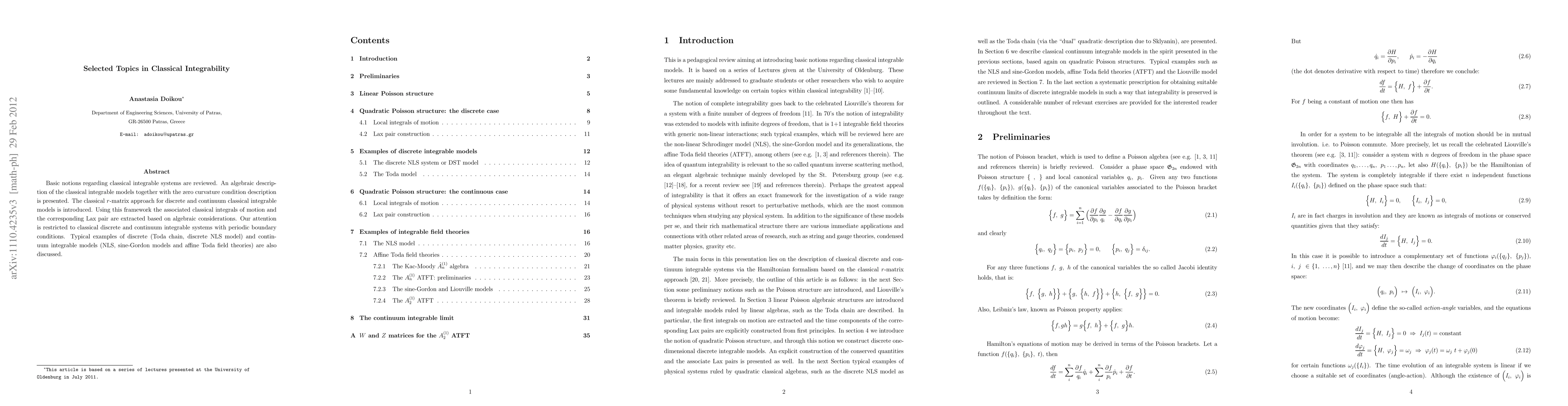 This paper reviews fundamental concepts in classical integrable systems, presenting algebraic and zero curvature descriptions. It introduces the classical r-matrix approach for both discrete and continuum models, extracting integrals of motion and Lax pairs, and focuses on systems with periodic boundary conditions, including examples like the Toda chain and sine-Gordon model.