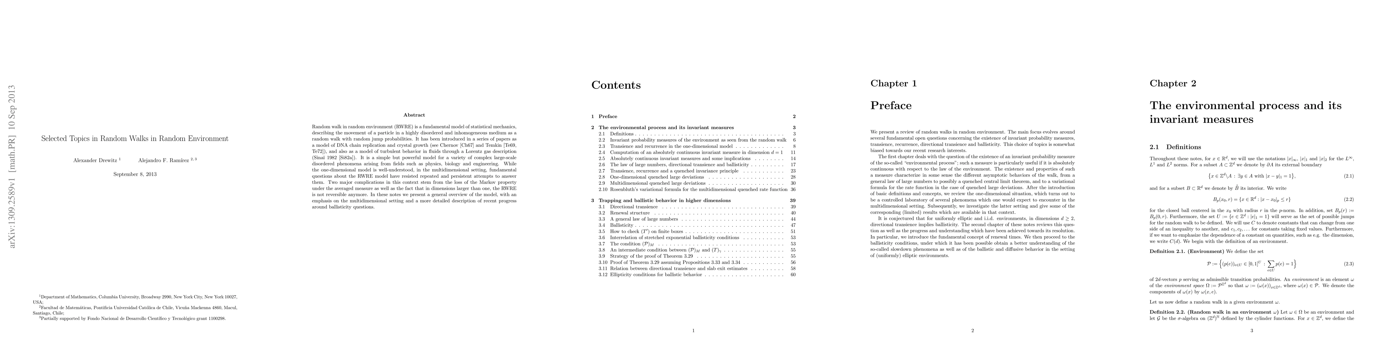Random walk in random environment (RWRE) is a fundamental model of statistical mechanics, describing the movement of a particle in a highly disordered and inhomogeneous medium as a random walk with random jump probabilities. It has been introduced in a series of papers by Chernov and Temkin as a model for DNA chain replication and crystal growth, and also as a model for turbulent behavior in fluids through a Lorentz gas description by Sinai. It is a simple but powerful model for a variety of complex large-scale disordered phenomena arising from fields such as physics, biology and engineering. While the one-dimensional model is well-understood, in the multidimensional setting, fundamental questions about the RWRE model have resisted repeated and persistent attempts to answer them. Two major complications in this context stem from the loss of the Markov property under the averaged measure as well as the fact that in dimensions larger than one, the RWRE is not reversible anymore. In these notes we present a general overview of the model, with an emphasis on the multidimensional setting and a more detailed description of recent progress around ballisticity questions.