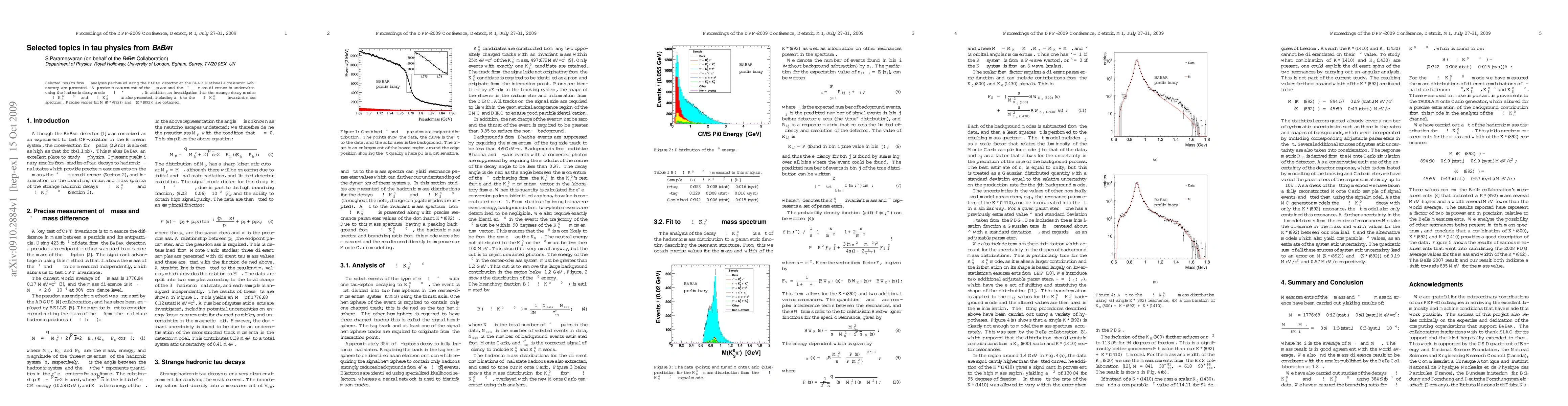 This paper presents selected results from tau physics analyses using the BaBar detector, focusing on precise measurements of the tau mass and mass difference, and investigations into specific tau decay modes, including obtaining precise values for the mass and width of the K*(892).