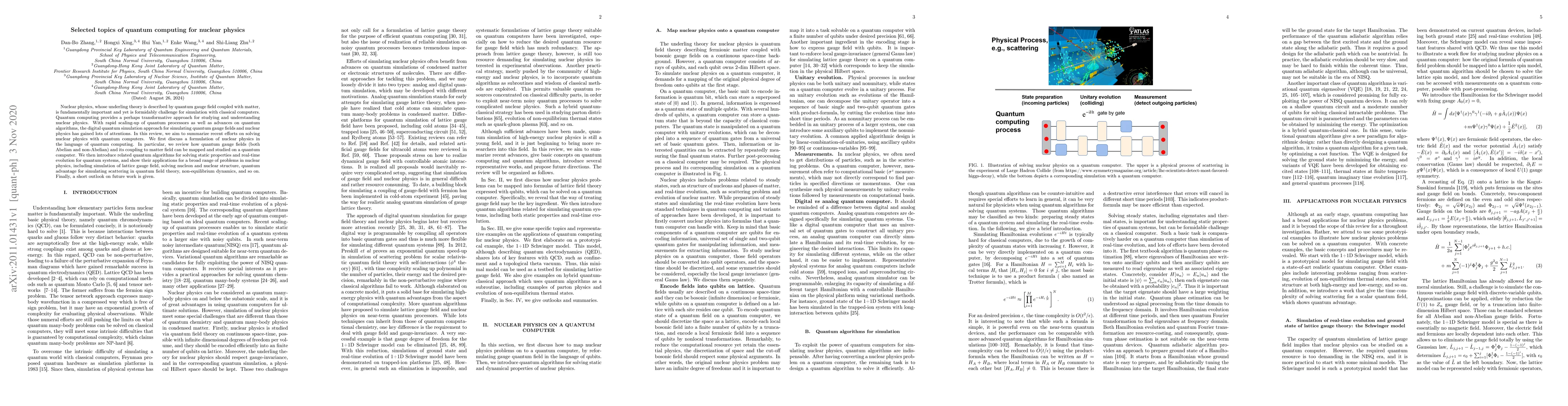 This paper reviews recent advances in applying quantum computing to nuclear physics, focusing on formulating nuclear theory in quantum computing terms and introducing quantum algorithms for simulating quantum gauge fields and nuclear structure. The paper also explores the potential quantum advantages for various nuclear physics problems and concludes with a brief outlook on future research directions.